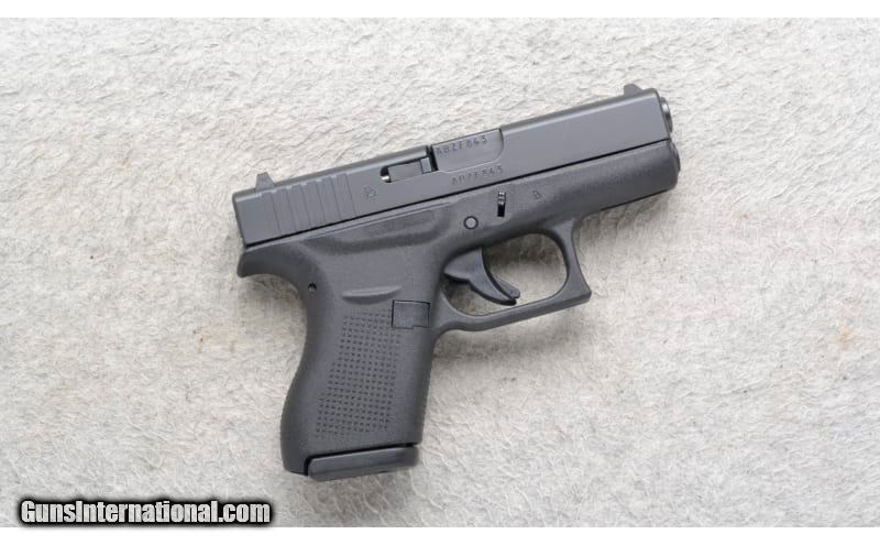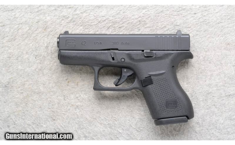 Description: This Glock Model 42 is a right hand semi-auto pistol in .380 ACP Cal. It has a 3.25 inch barrel with a rear serrated slide. A blade front sight and notch rear sight, both with white highlights. .380 ACP SOLD Chambers: 6 shot magazine. Metal Condition: Excellent. Bore Condition: Excellent. Barrels: 3.25 inch barrel. Weight: 12 oz. Sights: Blade front. Notch rear. White highlights. Item Location: Richfield, WI |