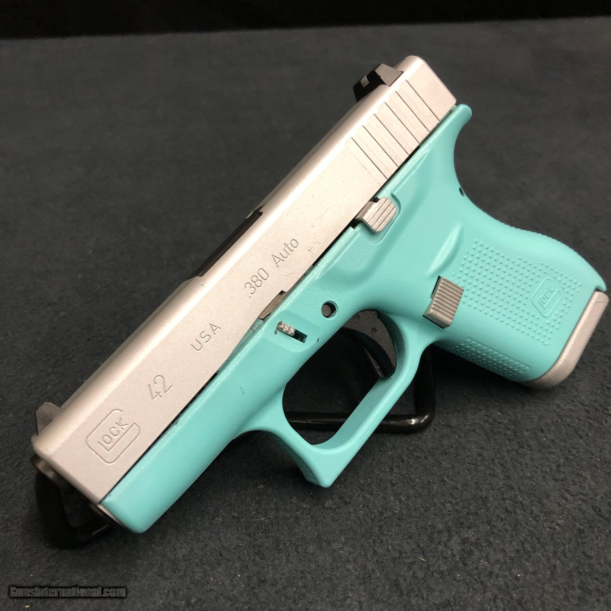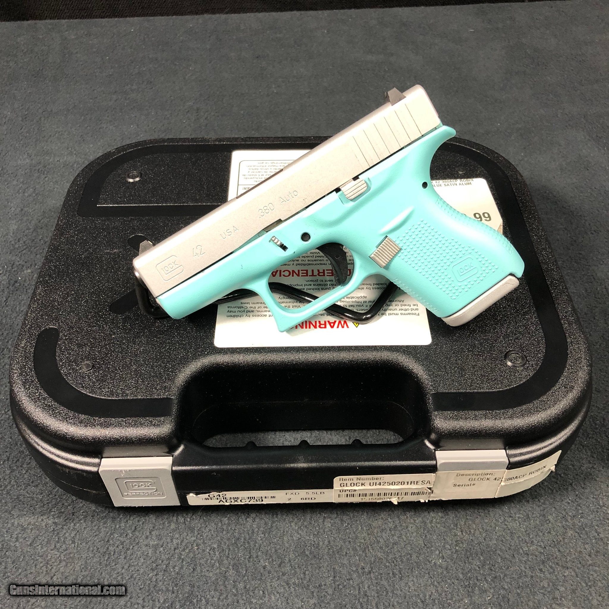 Description: Guns Listing ID: 598361 GLOCK Model 42 380 ACP Robins Egg Blue Finish / Silver (Two-Tone) Comes with Box and (1) 6 Round Magazine Great Condition!! Nice!! Manufacturer: GLOCK Model: 42 Caliber Info: .380 ACP Condition: Used - Non-Certified Barrels: 3" BARREL Action: SEMI AUTOMATIC Finish: ROBIN‚S EGG BL Price: $349.99 Contact Seller |