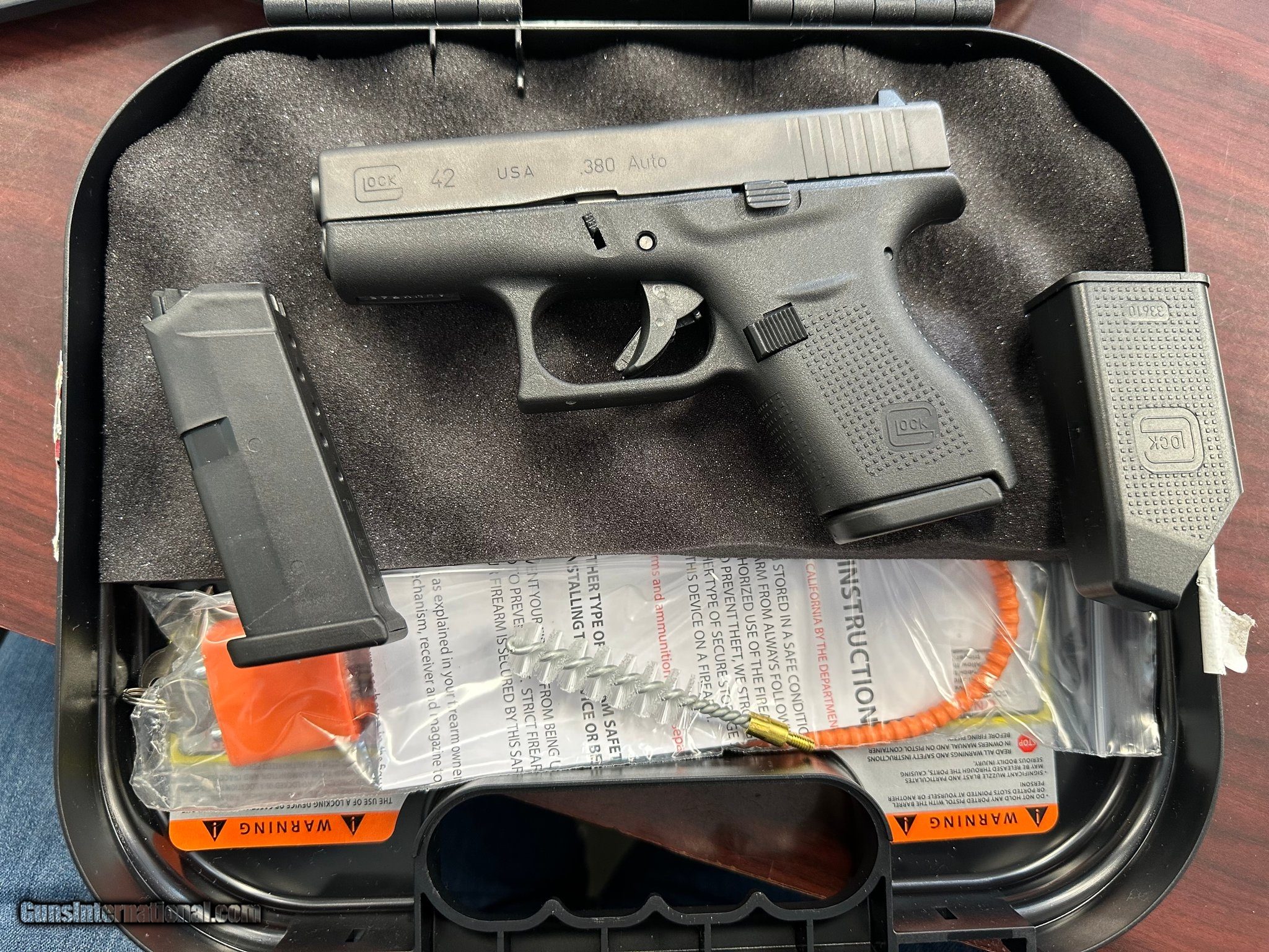 Description: Guns Listing ID: 492101 INCLUDES ORIGINAL BOX AND 2 MAGS SOLD Manufacturer: GLOCK Model: G42 Caliber Info: .380 ACP Condition: Used - Non-Certified Barrels: 3.25 BARREL Action: STRIKER Weight: .8 lbs. |