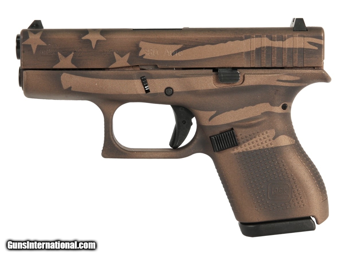 Description: Guns Listing ID: 483880 Consumers asked and Glock delivered, the Glock 42 is a slim, compact .380 that is the perfect deep concealment pistol. The smallest Glock ever made, the single stack .380 features a 6+1 capacity in a grip that features a Gen-4 style texture for a sure grip in any condition. A dual recoil spring assembly allows for reduced recoil and increased service life. Comes with all of the usual factory accessories, including box, manual, lock, two 6 round magazines and Cerakote battleworn bronze distressed flag finish. SOLD Manufacturer: GLOCK Model: G42 Caliber Info: .380 ACP Condition: new Barrels: 3.25" barrel Finish: BLACK |