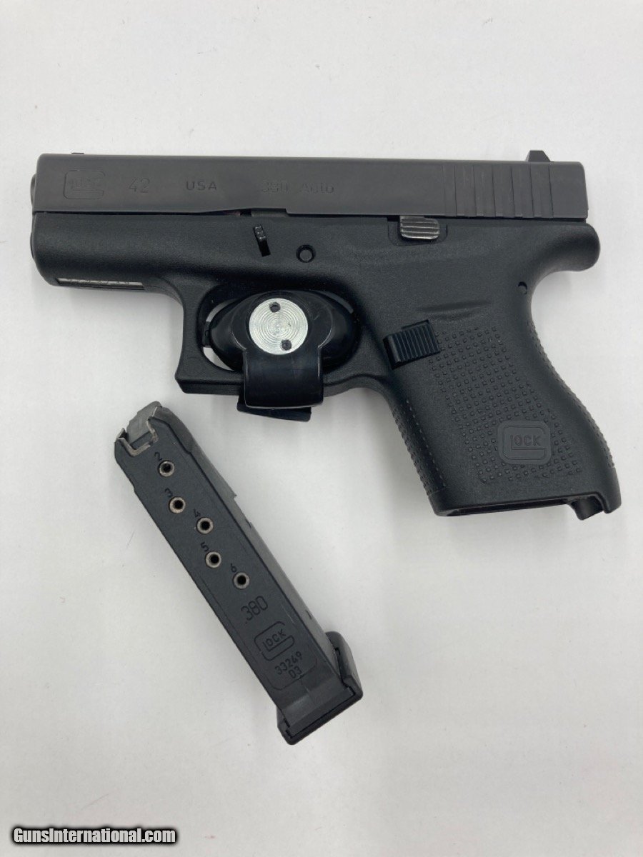 Description: Guns Listing ID: 1158626 The Glock 42 is a compact and reliable .380 ACP pistol, renowned for its concealability and Glock‚‚s trademark durability. With a 6+1 round capacity, it balances firepower with a slim profile, making it ideal for concealed carry. The polymer frame ensures lightweight portability, while the Safe Action trigger system enhances safety. Featuring a 3.25-inch barrel and simple design, the Glock 42 delivers accuracy and ease of use. Whether for personal defense or backup, this Glock pistol is a popular choice for those seeking a reliable and easily concealable firearm SOLD Manufacturer: GLOCK Model: Glock Model 42 380 acp Caliber Info: .380 ACP Condition: Used - Non-Certified Barrels: 3.5 BARREL Finish: BLUE |