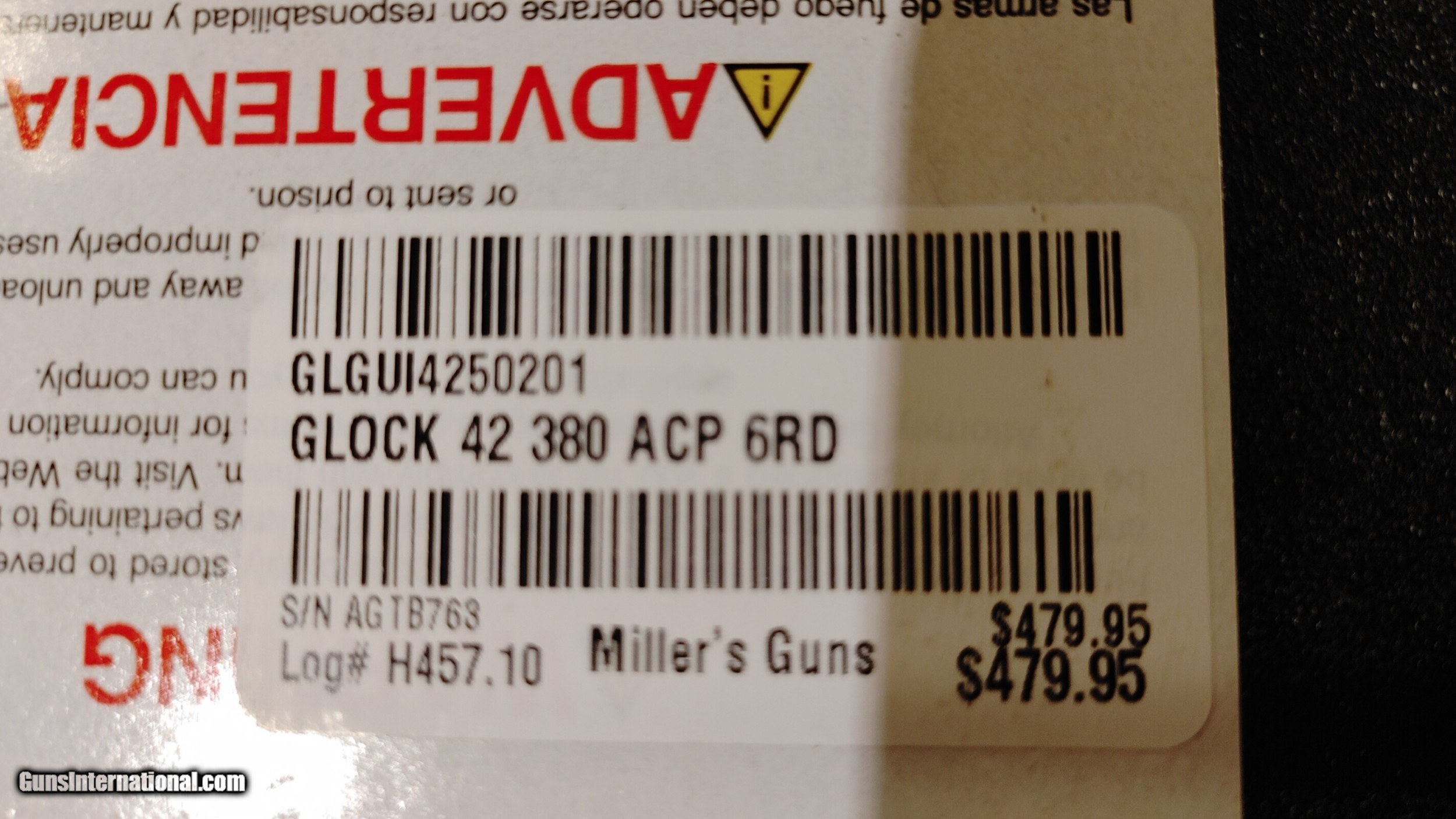 Description: new G42 G3 380ACP 6+1 3.25 FS W/TWO 6RD MAGS, ACC + CASE new in case (MODEL:G42); (ACTION:SAFE ACTION); (CAPACITY:6 + 1); (SIGHTS:FIXED GLOCK SIGHTS); (STOCKFRAMEGRIPS:POLYMER FRAME); (MAGAZINE:2 / 6 RD.); (WEIGHT:13.76 OZ.); (OVERALLLENGTH:5.94); (BARREL LENGTH:3.25); (DRILL-TAPPED:FALSE); (SEMI:SEMI); (AUTO PISTOL:AUTO PISTOL) Buyer pays shipping Millers Gun Center Located in New Castle, Delaware "Home of TAX-Free shopping" No Credit Card Fees Send Gun international inquiry and then call 302-328-9747 to complete your purchase SOLD Serial Number: AGTB763 |