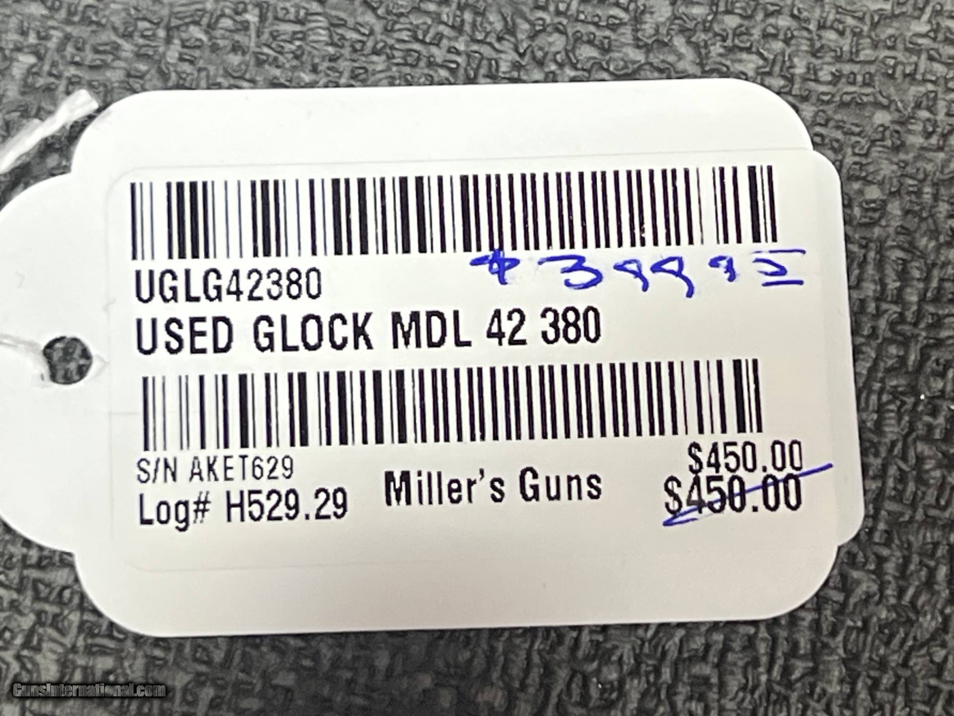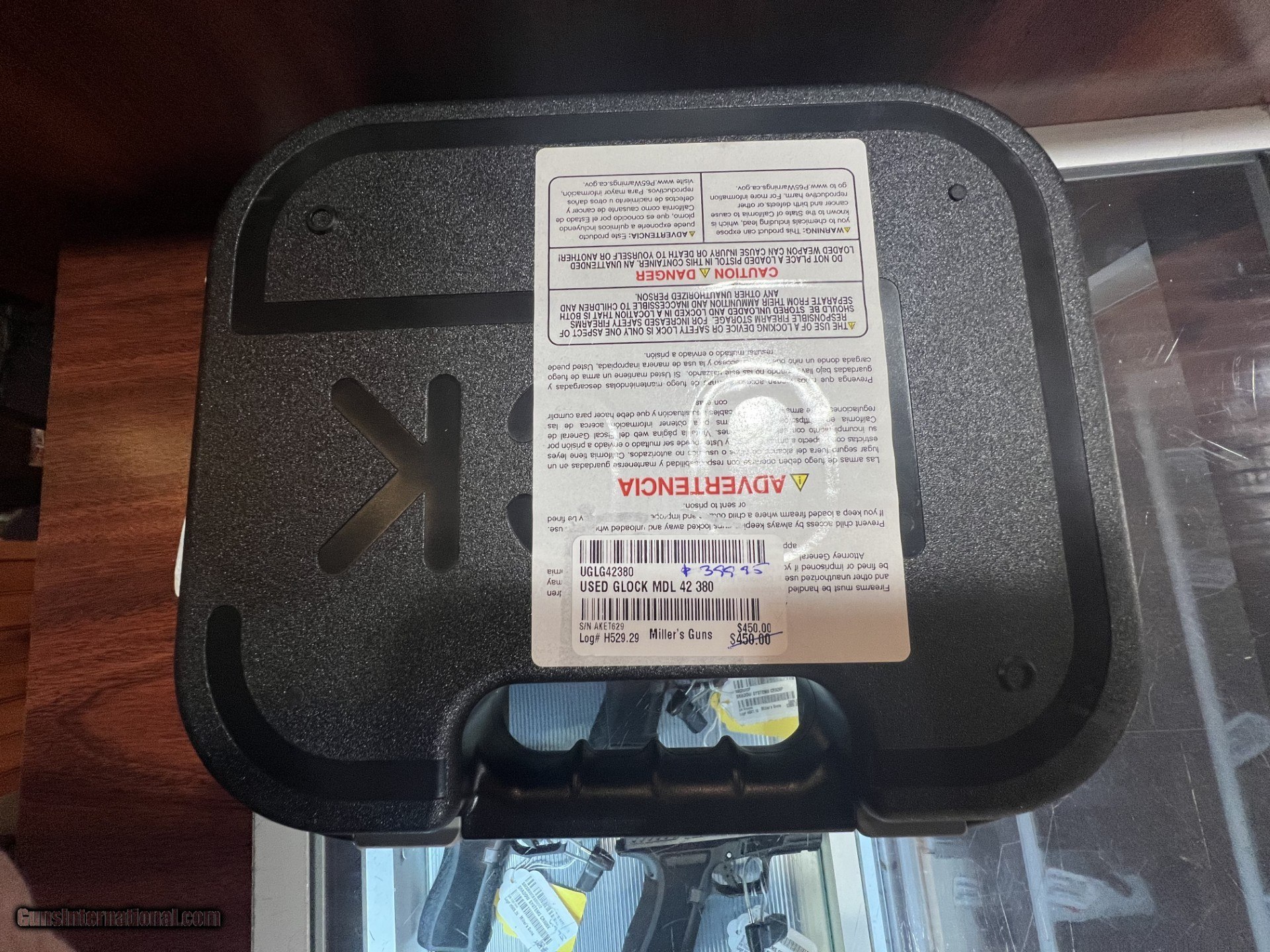 Description: Pre Owned Factory Hard Case Caliber 380 Magazine 1 Ca[acity 6 SOLD Handgun Caliber: .380 ACP (9x17mm Browning Short) Manufacturer: Glcok Model: 42 Serial Number: AKET629 Barrel Length: 3.25 Condition: VERY GOOD Metal Condition: Very Good Wood Condition: Very Good Bore Condition: Very Good |