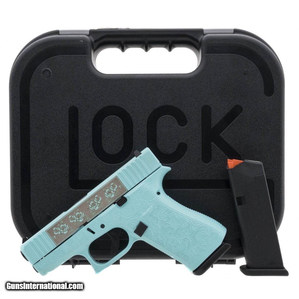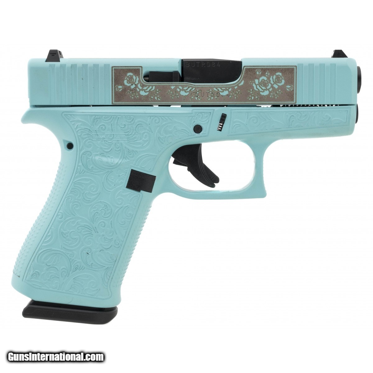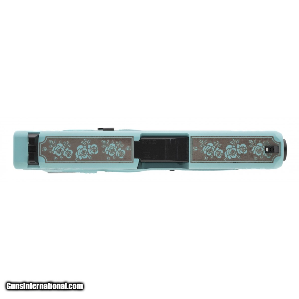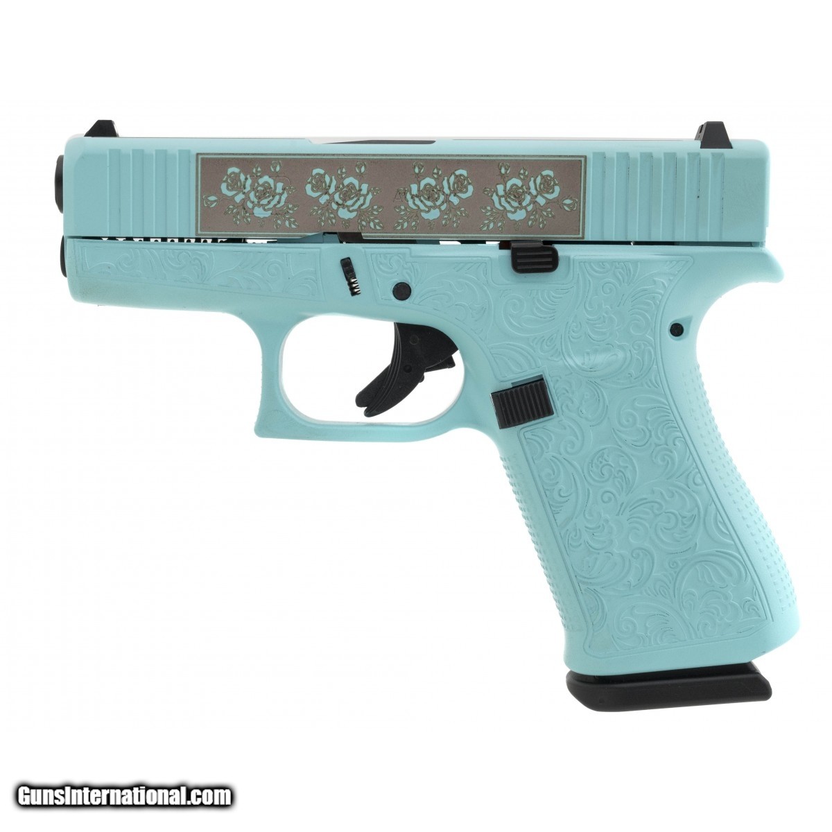 SN: BUTR084. Light blue single stack carry pistol with 3.41"" barrel and custom floral motif slide work and matching stippling. Overall excellent condition. Comes with box and extra magazine.