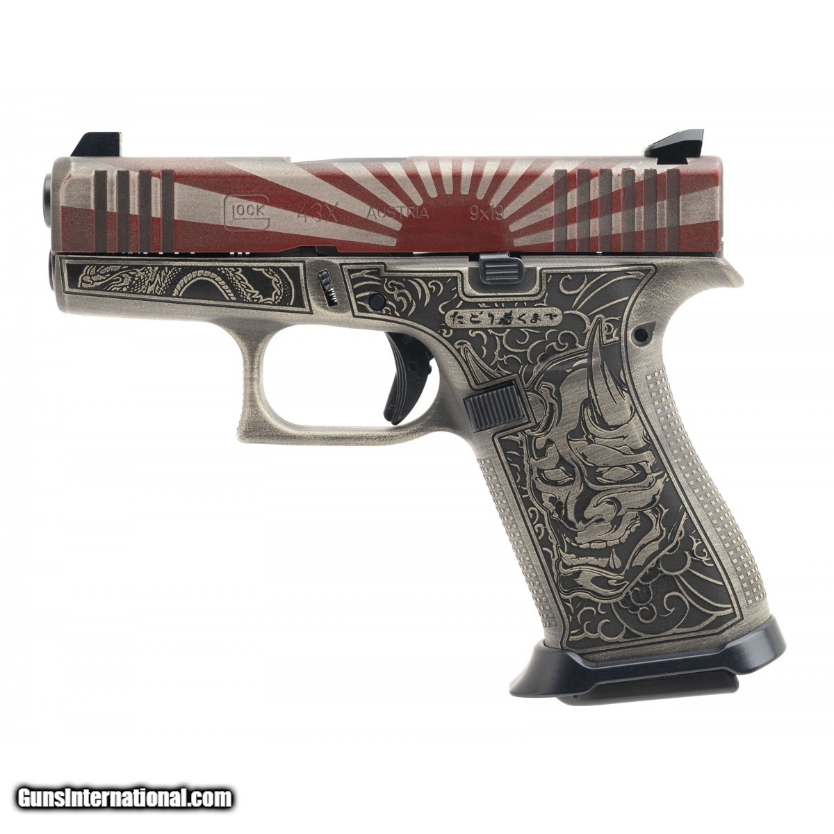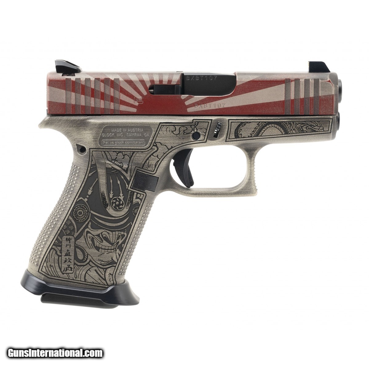 Description: " SN:BXBT107. Modern production, 9x19mm parabellum with a 3' barrel. Bore is in excellent condition. Glock rising sun Bushido battle worn finish with flared magwell and front and rear slide serration. Overall condition is excellent. Comes with box. SOLD |