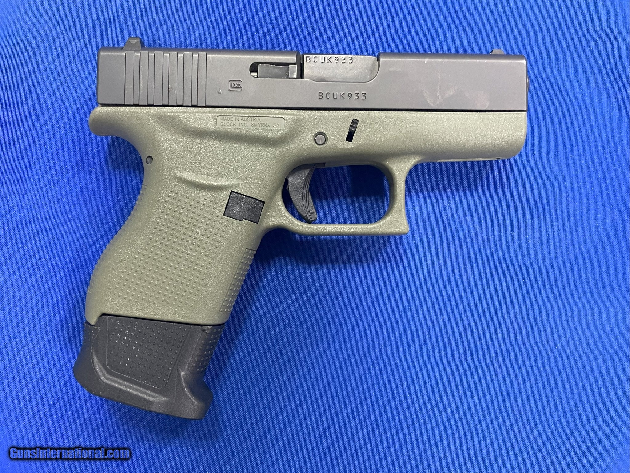 Description: Guns Listing ID: 1330931 Excellent Glock 43 thats black and Green with non factory hard case and one mag with a pinkie extension. SOLD Manufacturer: GLOCK Model: 43 Caliber Info: 9MM LUGER (9X19 PARA) Condition: Used - Non-Certified Barrels: 3.41 BARREL Finish: BLACK AND GREEN |