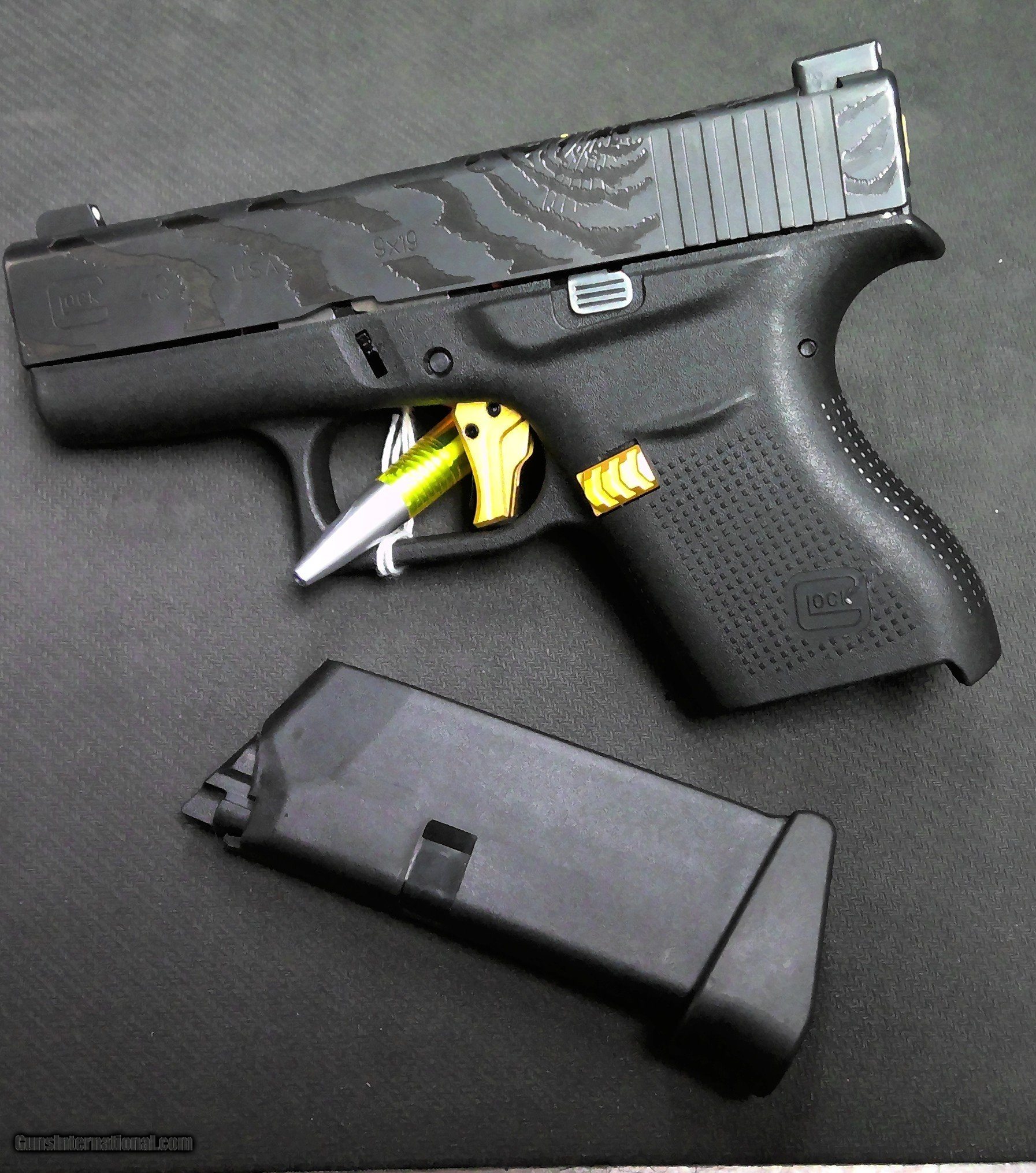 Description: Guns Listing ID: 493412 Glock 43 is in great condition Features a tiger engraved slide Has Tyrant Designs trigger and NDZ magazine release Comes with one 6 round magazine Chambered in 9x19 SOLD Manufacturer: GLOCK Model: 43 Caliber Info: 9MM LUGER (9x19 PARA) Condition: Used - Non-Certified Barrels: 3.41 BARREL Finish: TIGER STRIPE |