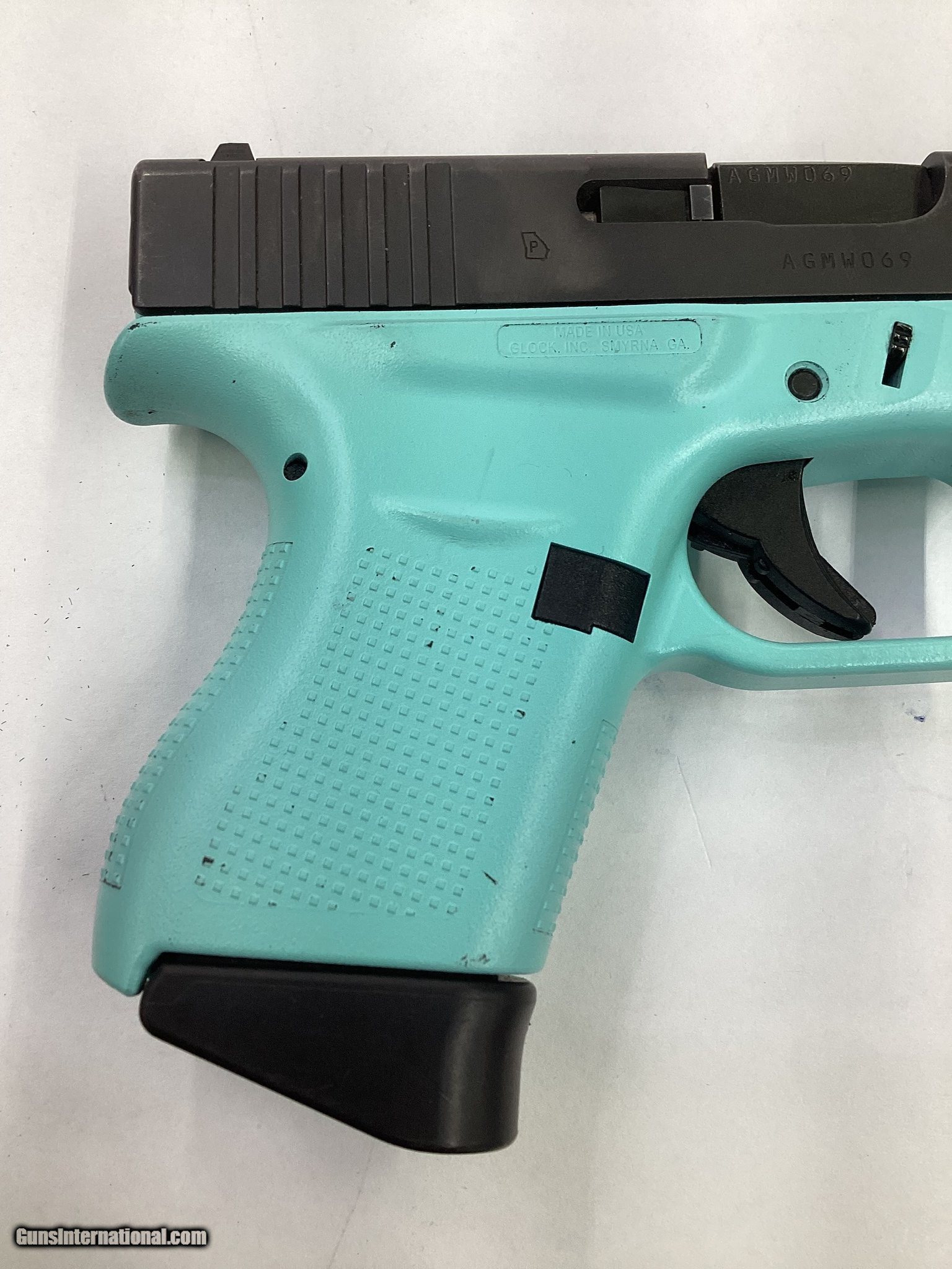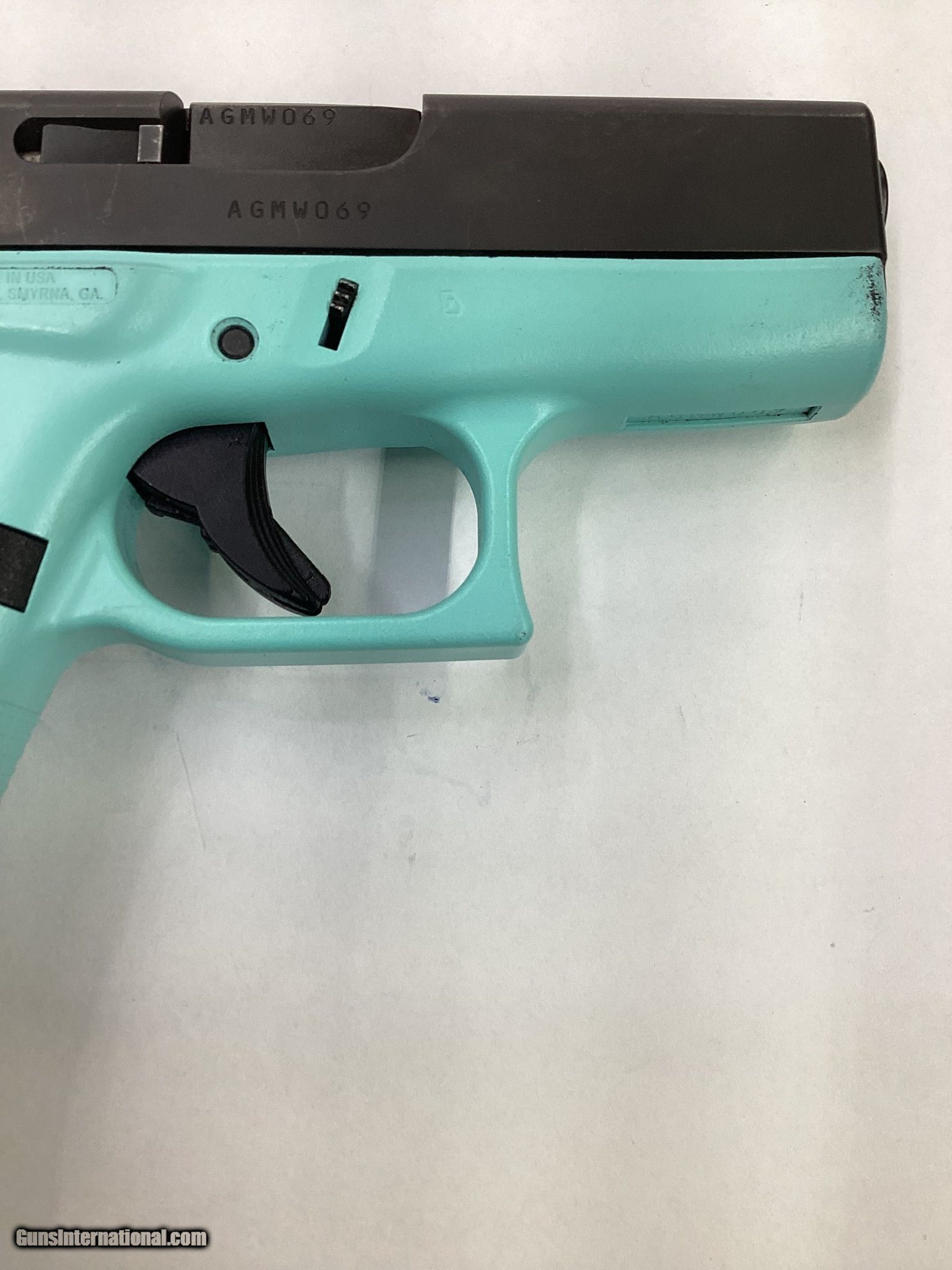Description: Guns Listing ID: 614134 TIFFANY BLUE AND BLACK GLOCK 43 WITH 1 MAGAZINE NO EXTRA ACCESSORIES COMES AS PICTURED Manufacturer: GLOCK Model: 43 Caliber Info: 9MM LUGER (9x19 PARA) Condition: Used - Non-Certified Barrels: 4" BARREL Action: SEMI AUTOMATIC Finish: two tone Price: $449.99 Contact Seller |
