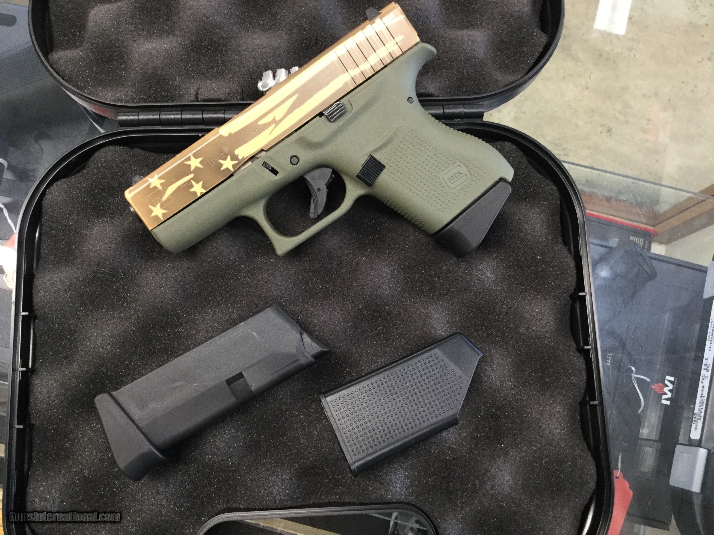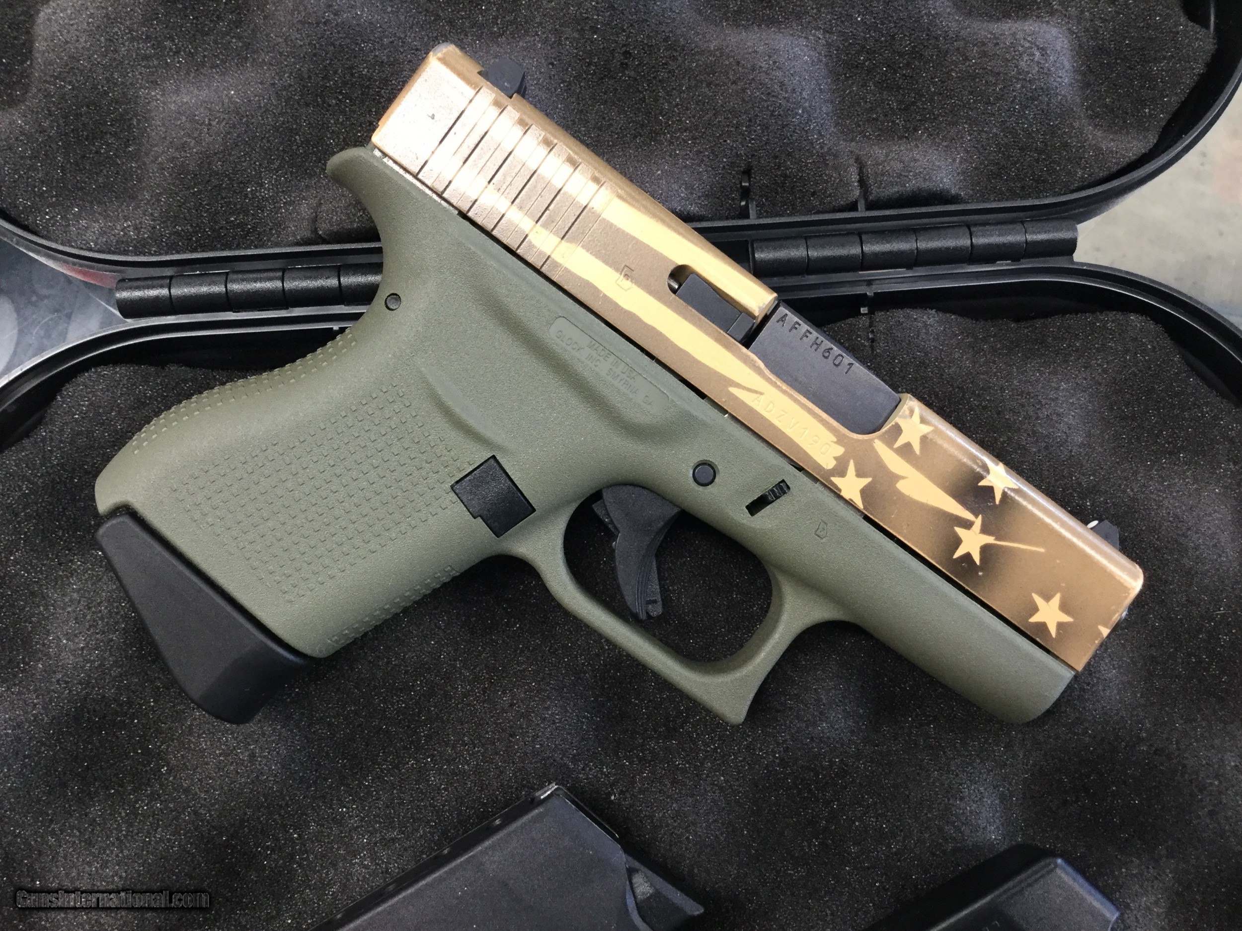 Description: ~~Used~~ Glock 43 9mm OD frame / Dark Earth & Tan Flag slide. Pistol is in excellent condition. Includes factory box, magazines and manual. $495.00 plus $35.00 insured and shipped to your FFL dealer. Add 3% for payments by card. SOLD |
