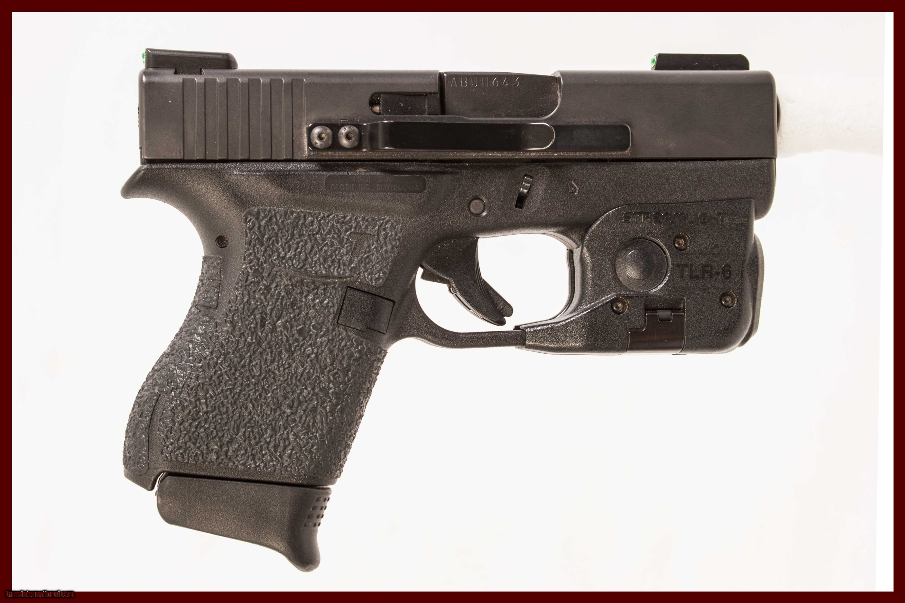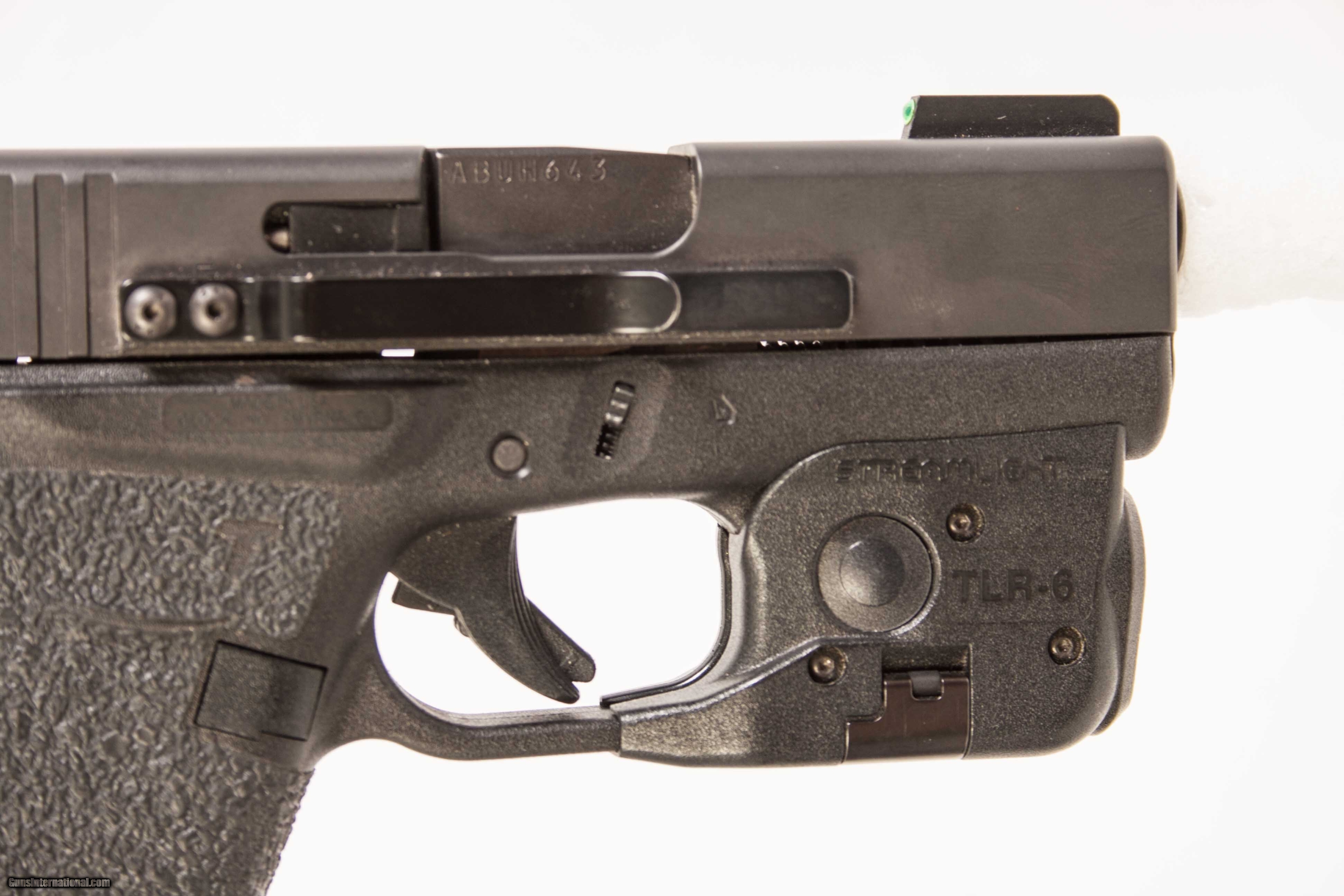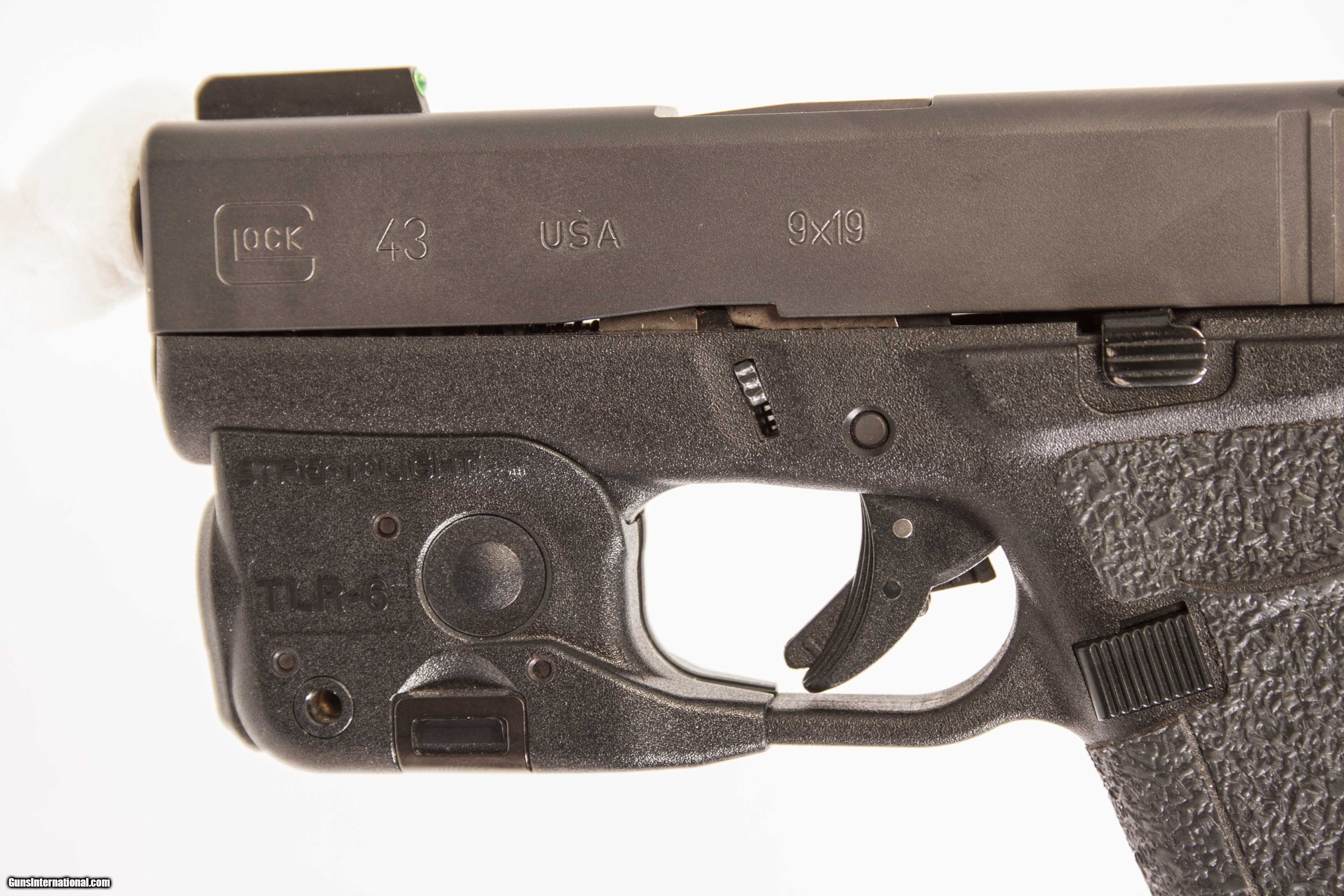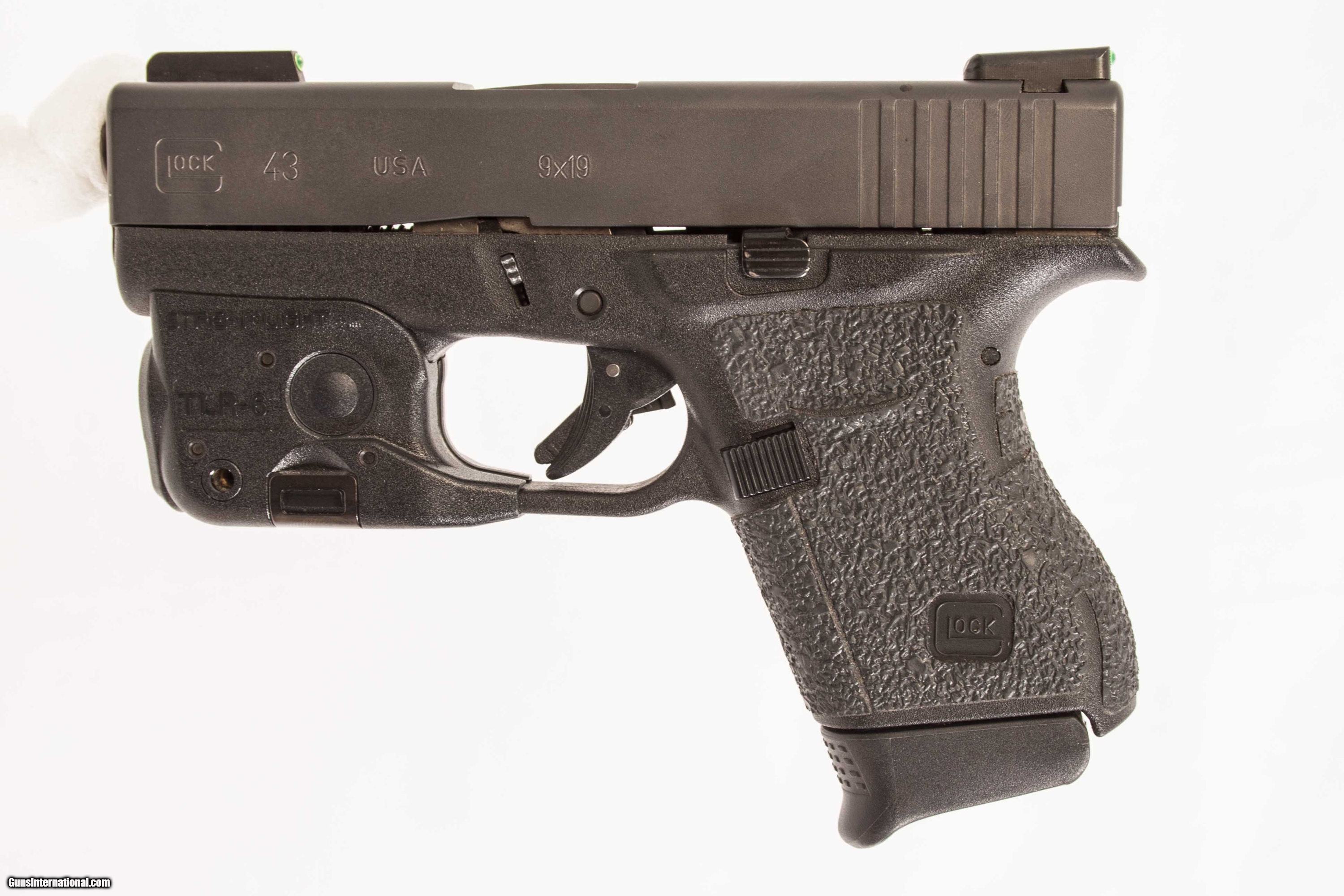 Glock model 43 chambered in 9mm with a 3 1/2 inch barrel with a bright bore good grooves original case and a Streamlight TLR-6 laser/flashlight. This gun is in excellent condition and is covered by Dury's Lifetime Warranty.