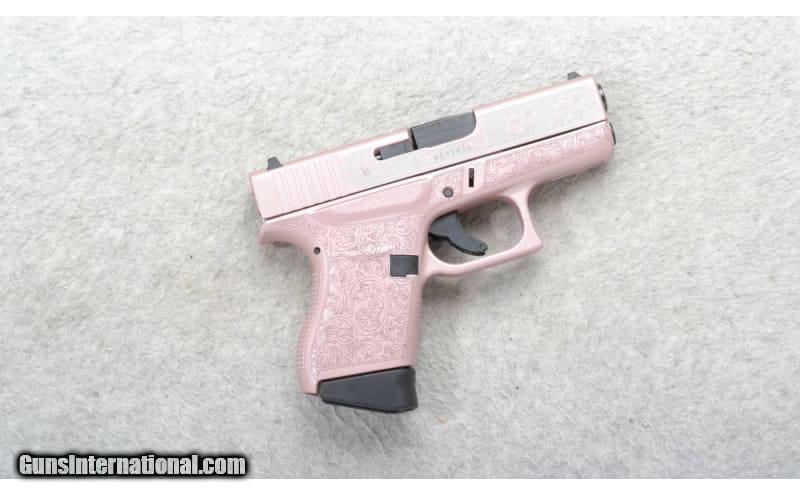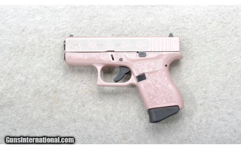 Description: This Glock Model 43 is a right hand semi-auto pistol in 9mm Cal. It has a 3 inch barrel with a rear serrated slide. A blade front sight and notch rear sight with white highlights. The slide is rose colored with multiple twin roses engraved on both sides. The frame and grip are rose colored with a LaFleur design engraved on it. The front and backstraps are dot checkered. 9mm Parabellum SOLD Chambers: 6 shot magazine. Metal Condition: Excellent. Bore Condition: Excellent. Barrels: 3 inch barrel with a rear serrated slide. Weight: 20 oz. Sights: Blade front. Notch rear. Both with white highlights. Item Location: Richfield, WI |