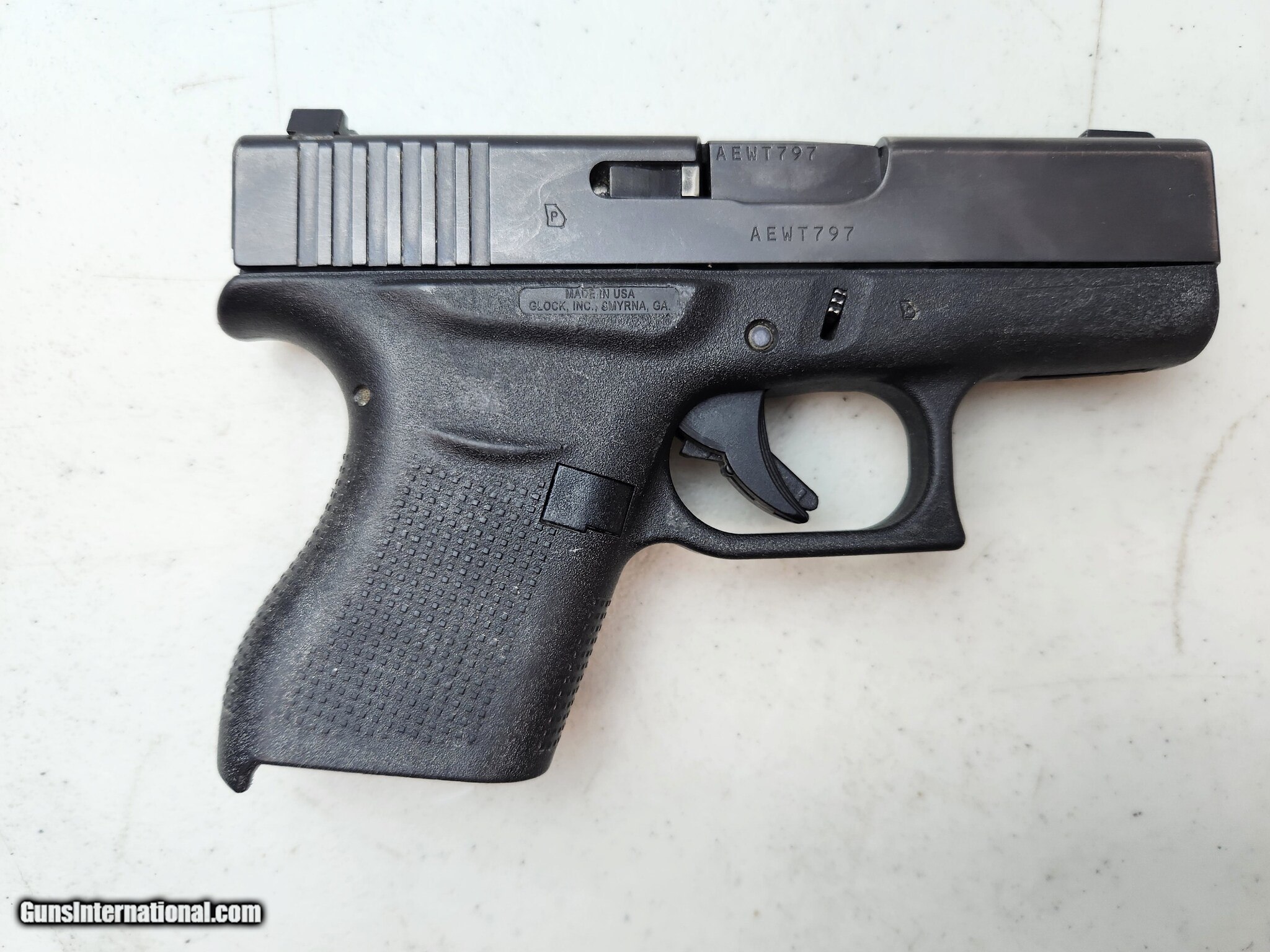 Description: Guns Listing ID: 803382 GLOCK 43 - 9MM - 10 ROUNDS - 3.4 \" Gun includes GLOCK 43 - 9MM - 10 ROUNDS - 3.4 \", with non-original clear plastic clip. No original clip included. Gun shows wear including wear/scratches on barrel, light dings/scratches seen on end of barrel, dirt/tarnish or discoloration seen on barrel. Grip shows light dirt, discoloration spots. Specifics: GLOCK 43 The G43 is a GLOCK Single stack, 9 mm Luger caliber pistol. It is ultra-concealable, accurate and a great tool for all shooters regardless of one’s hand size. The grip has a built-in beaver tail design which allows the shooter to acquire a high and tight grip. The aggressive texture of the grip surface allows for comfortable and reliable operation of the pistol. Engineered based on the same superlative standards that GLOCK is famous for, the tiny G43 tolerates the same torture tests all its bigger brothers in the GLOCK pistol family withstand. See photos for more details. SKU: FCN009806 KCD SOLD Manufacturer: GLOCK Model: 43 Caliber Info: 9MM LUGER (9X19 PARA) Condition: Used - Non-Certified Barrels: 3.4 BARREL Finish: BLACK |