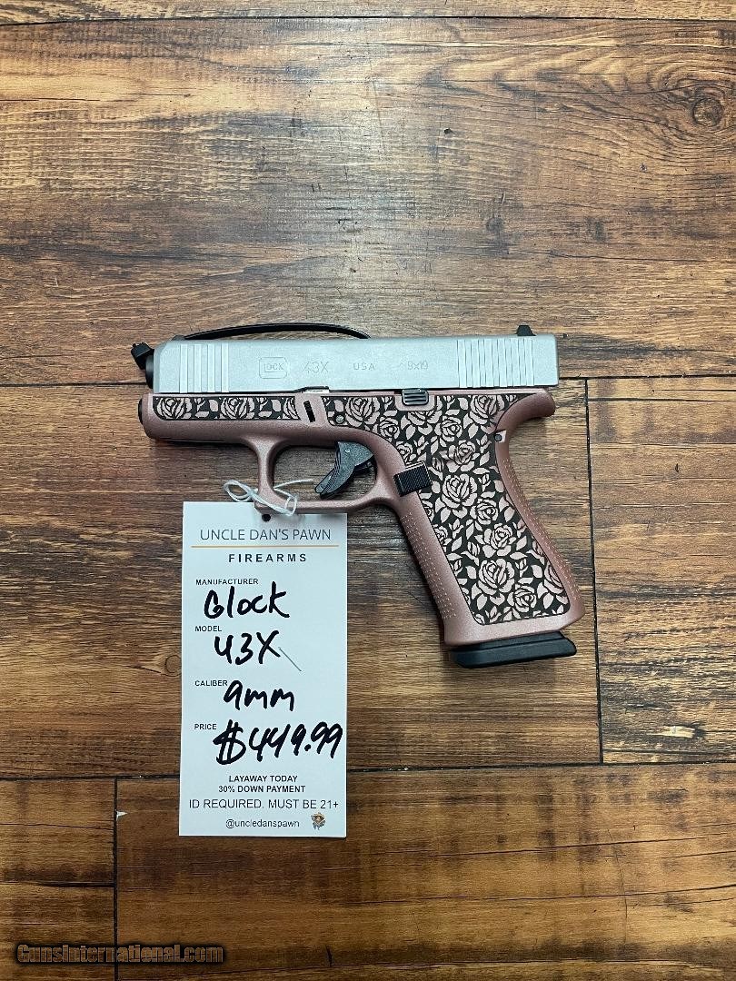 Description: Guns Listing ID: 565923 GLOCK 43X ROSE ENGRAVED 9X19 Manufacturer: GLOCK Model: 43x Caliber Info: 9MM LUGER (9x19 PARA) Condition: Used - Non-Certified Barrels: 3" BARREL Action: SEMI AUTOMATIC Finish: custom Price: $449.99 Contact Seller |