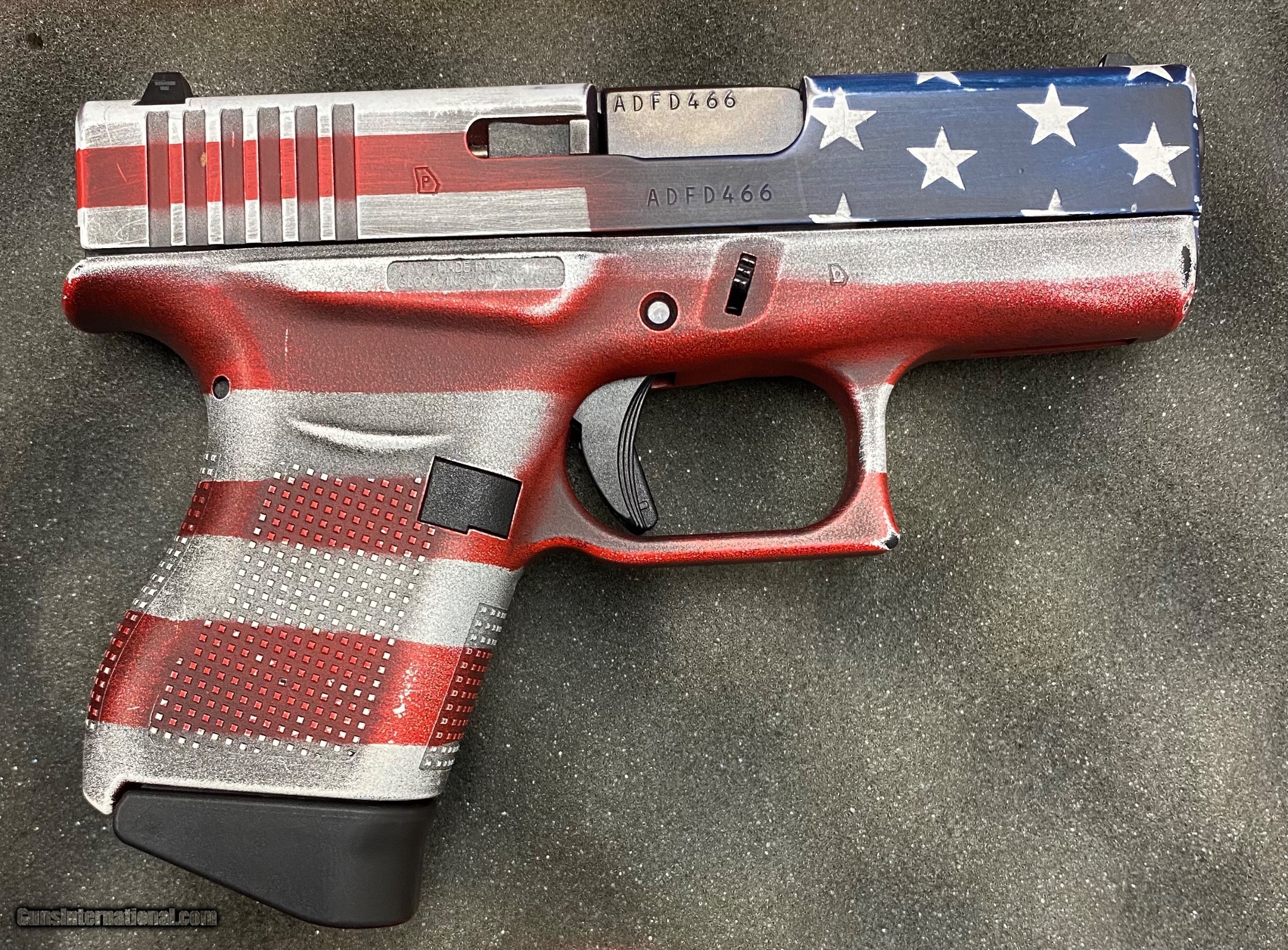 Description: Preowned Classic Glock G43 9MM with the American Flag Red, White & Blue finish. Fabulous looking gun that has a bright shiny bore and in very good condition overall. Functions fine. Very nice collectible Glock. Extra magazine and red carry case included. $25.00 insured shipping. SOLD Handgun Caliber: 9x19mm Parabellum (9mm Luger, 9x19mm NATO) Manufacturer: Glock Model: G43 Serial Number: ADFD466 Barrel Length: 3.39” Condition: Very good Metal Condition: Very good Bore Condition: Very good Action: Semi-auto Finish: Red, White & Blue Case: Yes Item Location: WV |