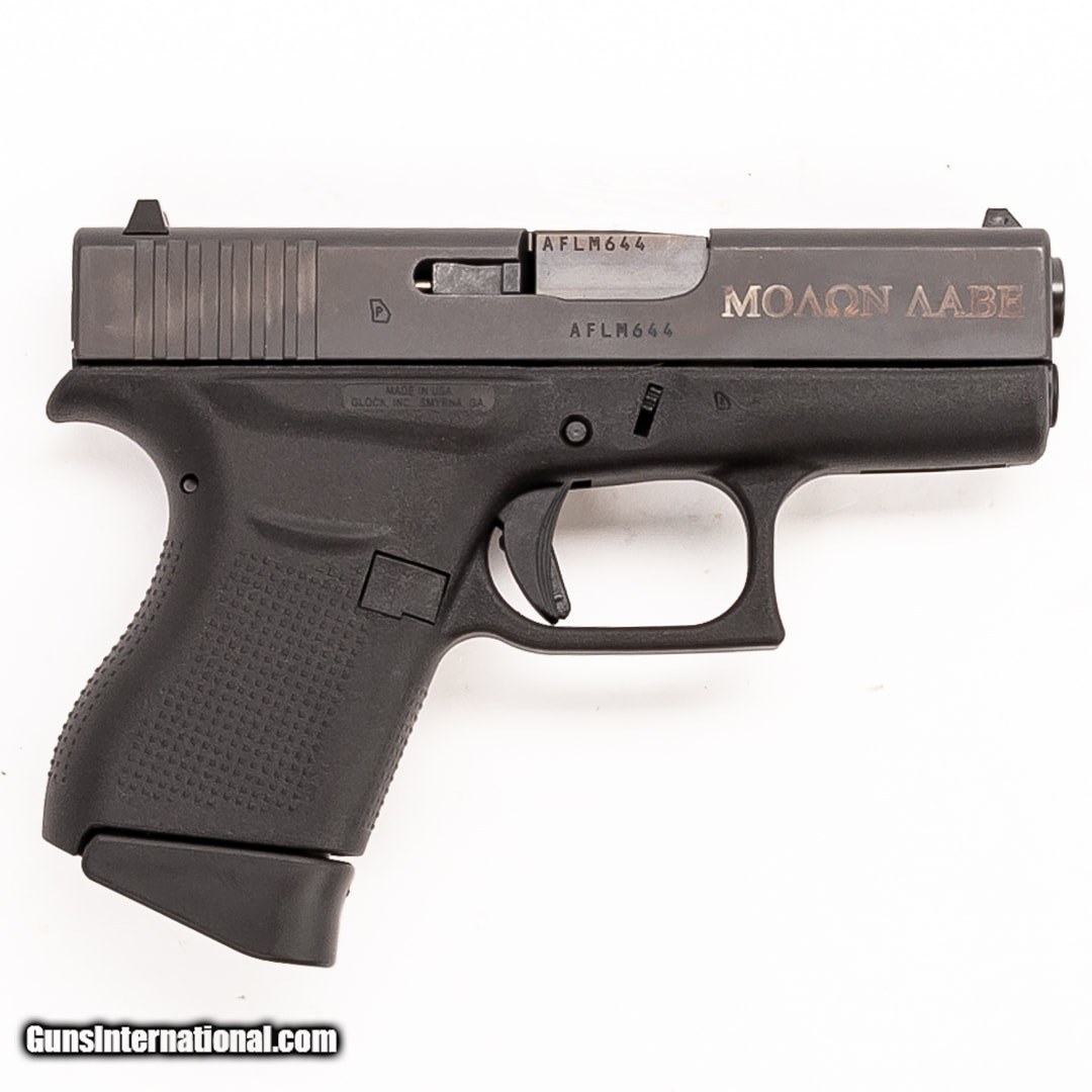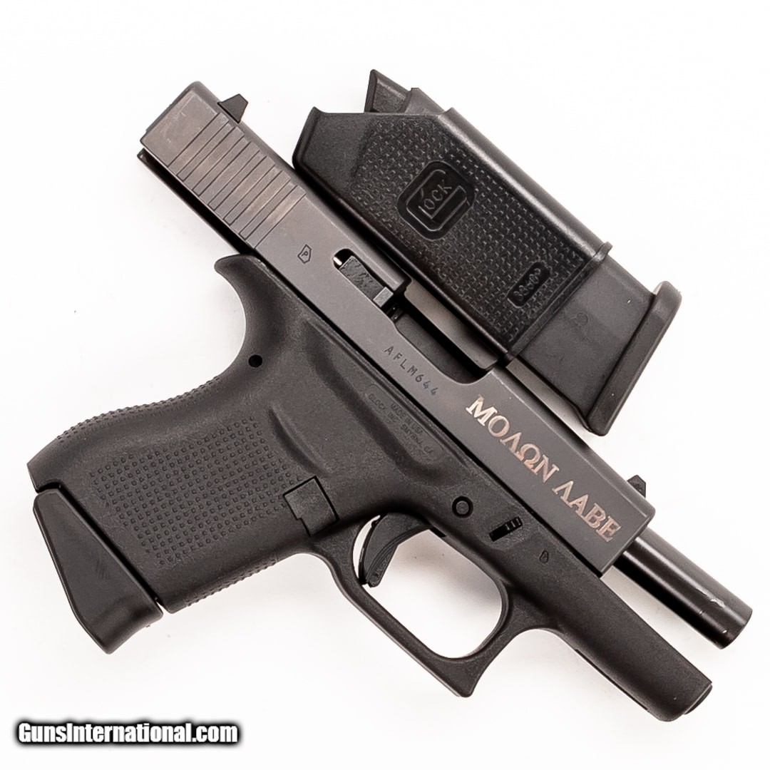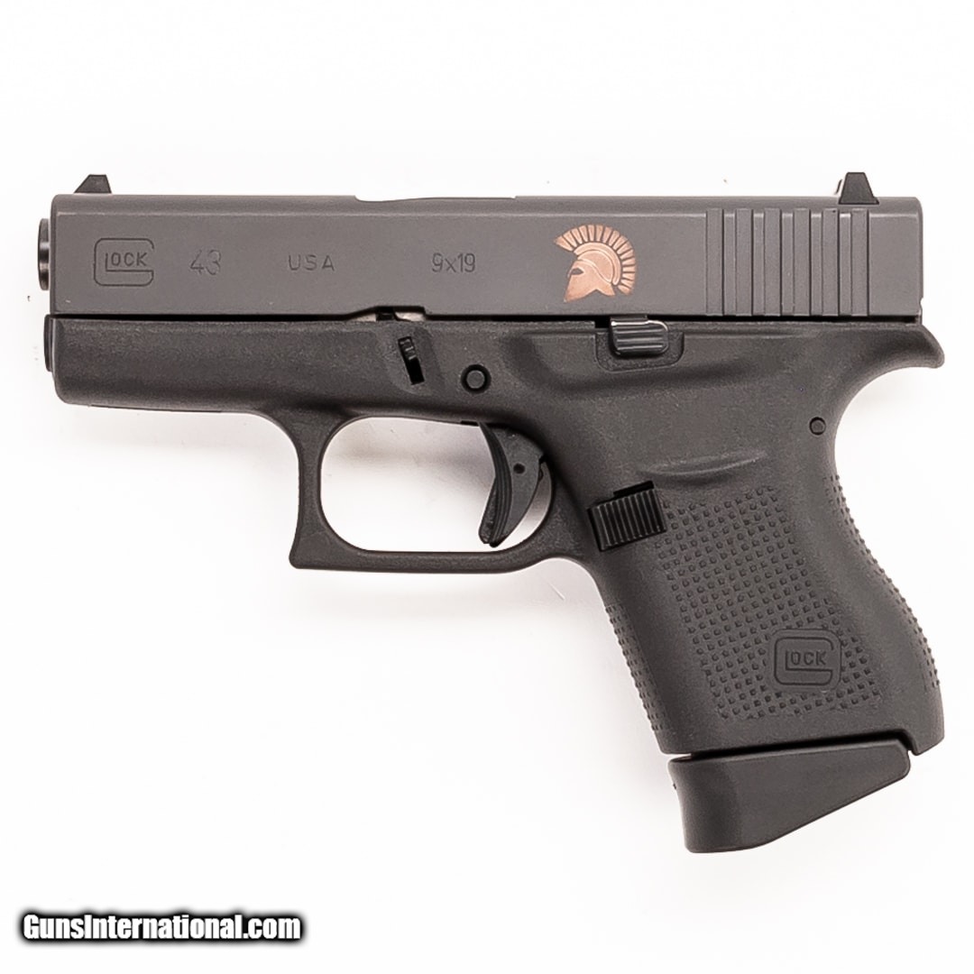 Description: Guns Listing ID: 373004 The Glock 43 is an award-winning single stack 9mm handgun known for its ease of concealment, accuracy, and reliability. This pistol is an excellent option for daily carry or a deeply concealed back up for individuals such as law enforcement agents, defense contractors, and security guards. This G43 is the "Spartan" model. It says "Molon Labe" on one side of the slide (Which roughly translates to come and take it) and has a Spartan helmet on the other side. 2-6 round magazines, the original case, and a manual are included. SOLD Manufacturer: GLOCK Model: G43 "SPARTAN Caliber Info: 9MM LUGER Condition: Used - Certified Barrels: 34 BARREL Finish: BLACK |