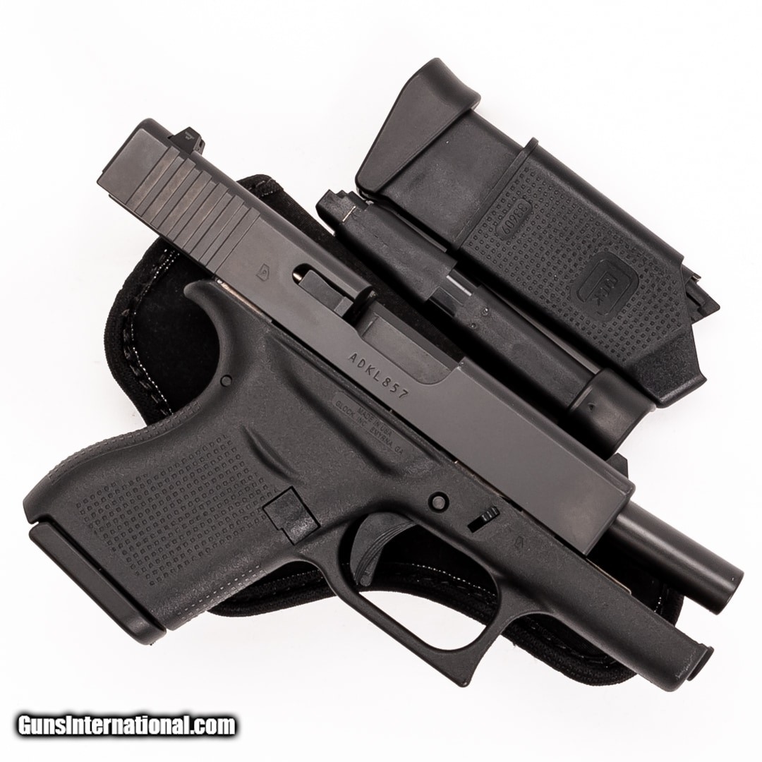 Description: Guns Listing ID: 343267 This compact Glock 43 makes a great home-defense and concealed carry sidearm thanks to its comfortable ergonomics, aggressive texturing, and unquestionable reliability. This G43 comes with three 6-round magazines, an Aliengear IWB holster, and the original case with the manual. SOLD Manufacturer: GLOCK Model: G43 Caliber Info: 9MM LUGER (9X19 PARA) Condition: Used - Certified Barrels: 3.4 barrel Finish: BLACK |