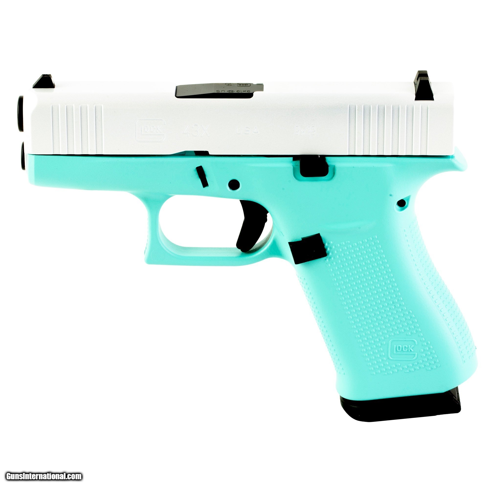Description: Guns Listing ID: 334569 Glock G43X, Semi-automatic, Striker Fired, Sub-Compact, 9MM, 3.41\" Barrel, Cerakote Finish, Robin‚‚s Egg Blue With Pearl White Slide, 10 Rounds, 2 Magazine SOLD Manufacturer: GLOCK Model: G43X Caliber Info: 9MM LUGER (9X19 PARA) Condition: new Barrels: 3.41 BARREL Action: STRIKER Finish: ROBIN‚‚S EGG BLU |