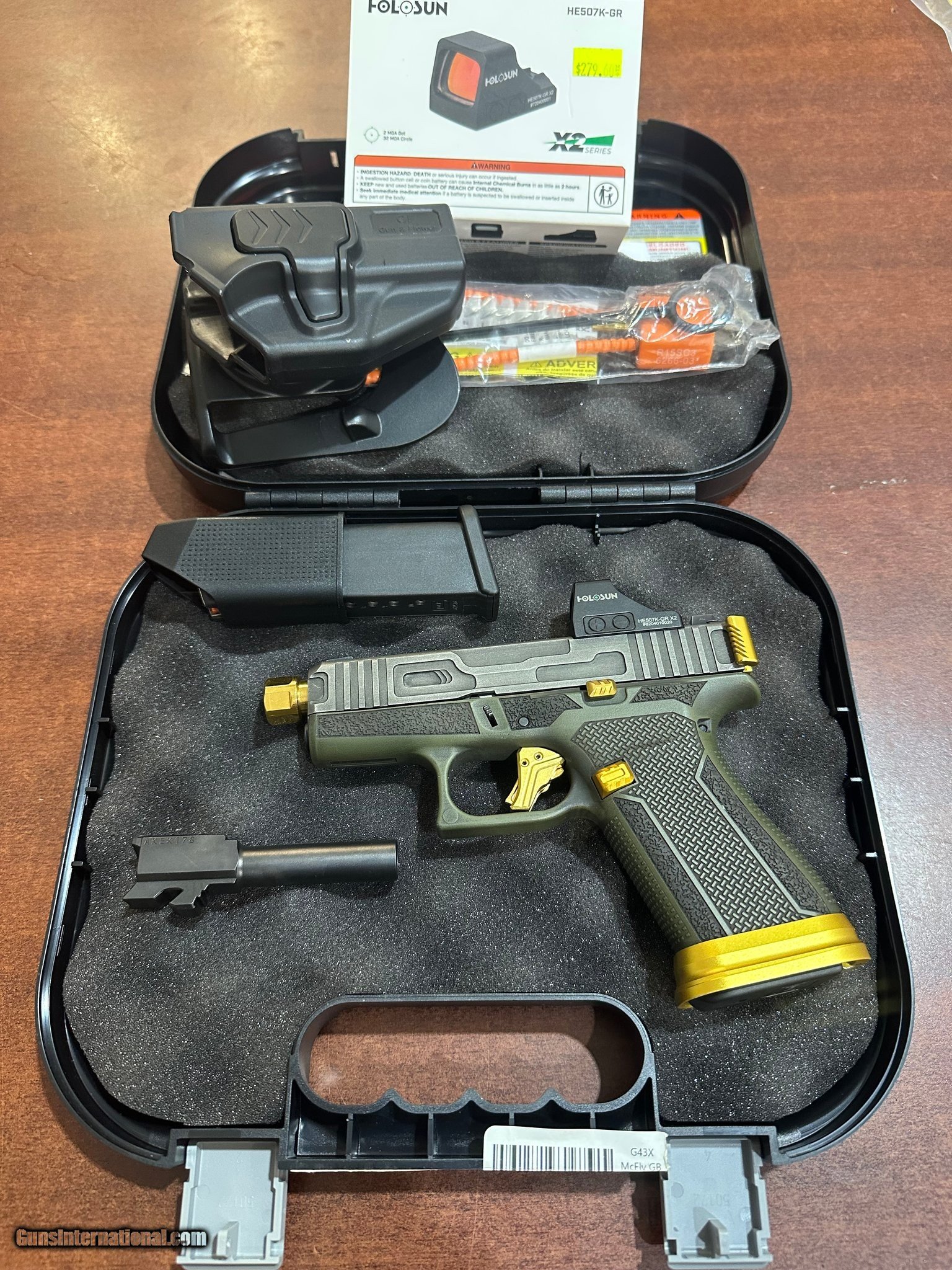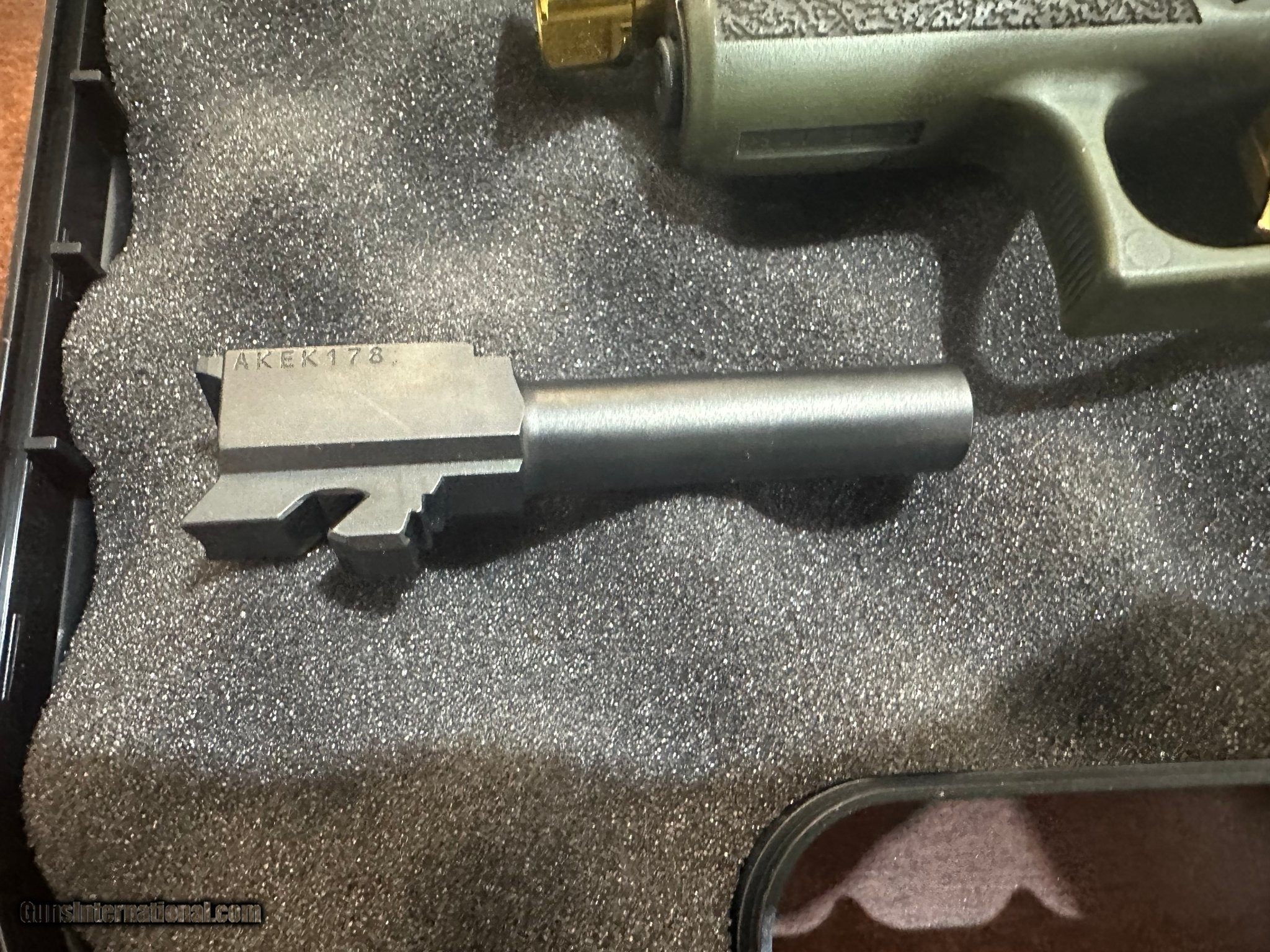 Description: Guns Listing ID: 576630 You are looking at a used but like new Glock 43X in excellent condition. This pistol has been customized by Shark Coast Tactical, and has also had more aftermarket upgrades. Shark coast tactical calls this model the McFly. The original buyer has added an extended/enlarged gold magazine release and slide release. The gold barrel (added by SCT) is threaded. He also added the NDZ easy cock gold backplate. The trigger is an upgraded gold metal trigger. This pistol comes with a Holosun 507K-GR green dot mounted on top as well! The texture on the slide and frame, as well as the color, was done by shark coast tactical. The optic cut was done by shark coast tactical and the optic is direct mount! No need to worry about optic plate screws backing out! Comes with the original box, original blued barrel, and an aftermarket holster. Also comes with the box for the optic. Manufacturer: GLOCK Model: G43X Caliber Info: 9MM LUGER (9X19 PARA) Condition: Used - Non-Certified Barrels: 3.9" BARREL Action: SEMI AUTOMATIC Finish: BLACK AND GOLD Price: $899.99 Contact Seller |