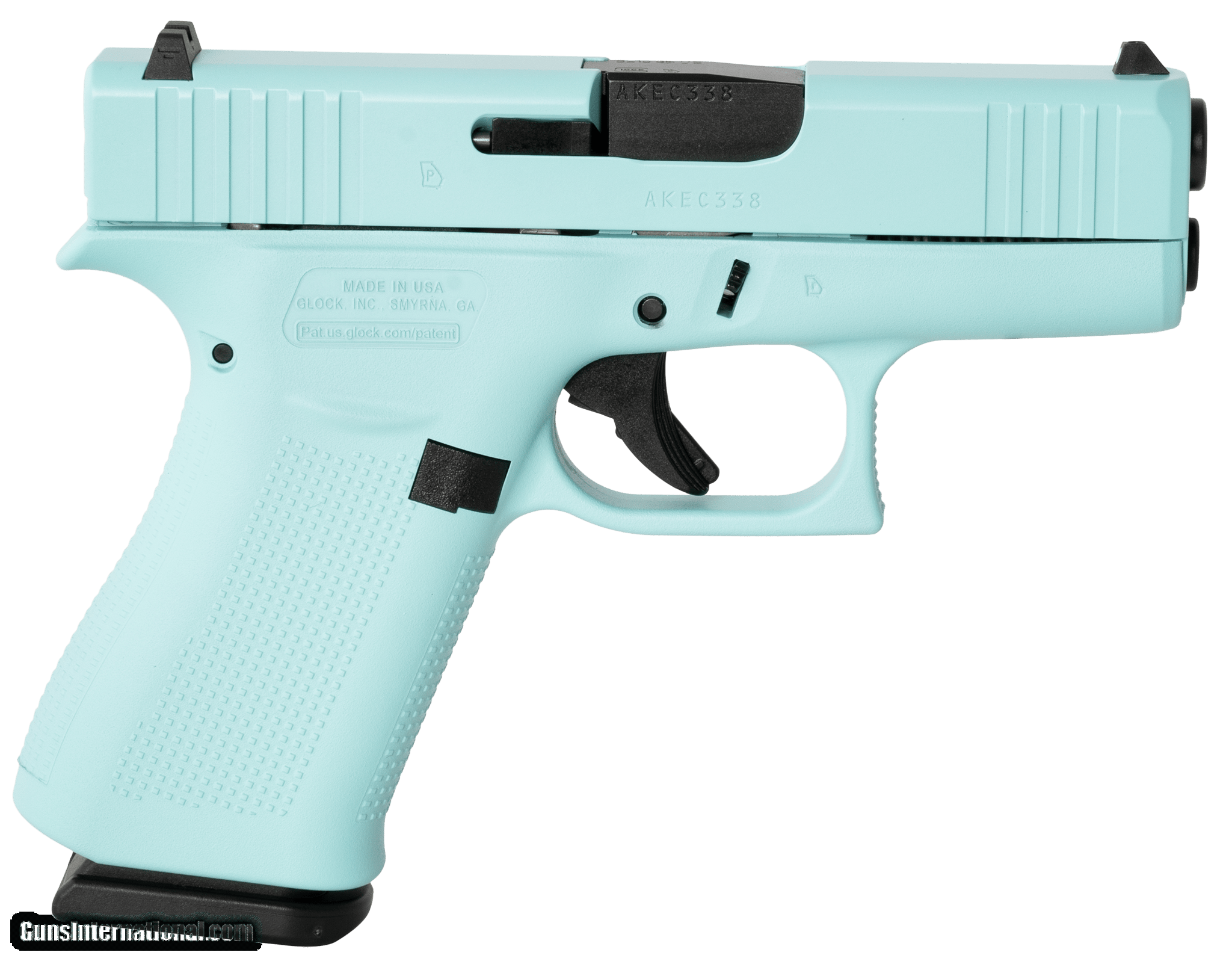 Description: Guns Listing ID: 587455 Glock G43X Slim Sub-Compact Frame 9mm Luger 10+1 3.41\" Black GMB Barrel, Robins Egg Blue Cerakote Serrated Steel Slide, Robin Egg Blue Cerakote Polymer Frame w/Beavertail, USA Made The Glock G43X combines a compact-size grip length, a built-in beaver tail and a subcompact-slim slide for a comfortably balanced firearm. Features Glock‚s Safe Action system which provides a consistent trigger pull from the first to the last round; three automatic independently operating mechanical safeties; frame is made of polymer with hardened steel guides; ideal grip angle and low weight. The advanced surface treatment of the slide results in optimal hardness by considerably reducing wear and tear and it makes it corrosion resistant, even when operating in saltwater conditions. The matte surface minimizes light reflection. Its extractor serves as a loaded chamber indicator to comply with the laws of certain states and its position may visually and physically indicate whether there is a cartridge in the chamber of the pistol. Includes 2 magazines, mag loader, cleaning set, pistol case and cable lock. Manufacturer: GLOCK Model: G43X Caliber Info: 9MM LUGER (9x19 PARA) Condition: new Barrels: 3.41" BARREL Action: SEMI AUTOMATIC Finish: ROBIN‚S EGG BLUE Weight: 1.4 LBS. Price: $549.99 Contact Seller |