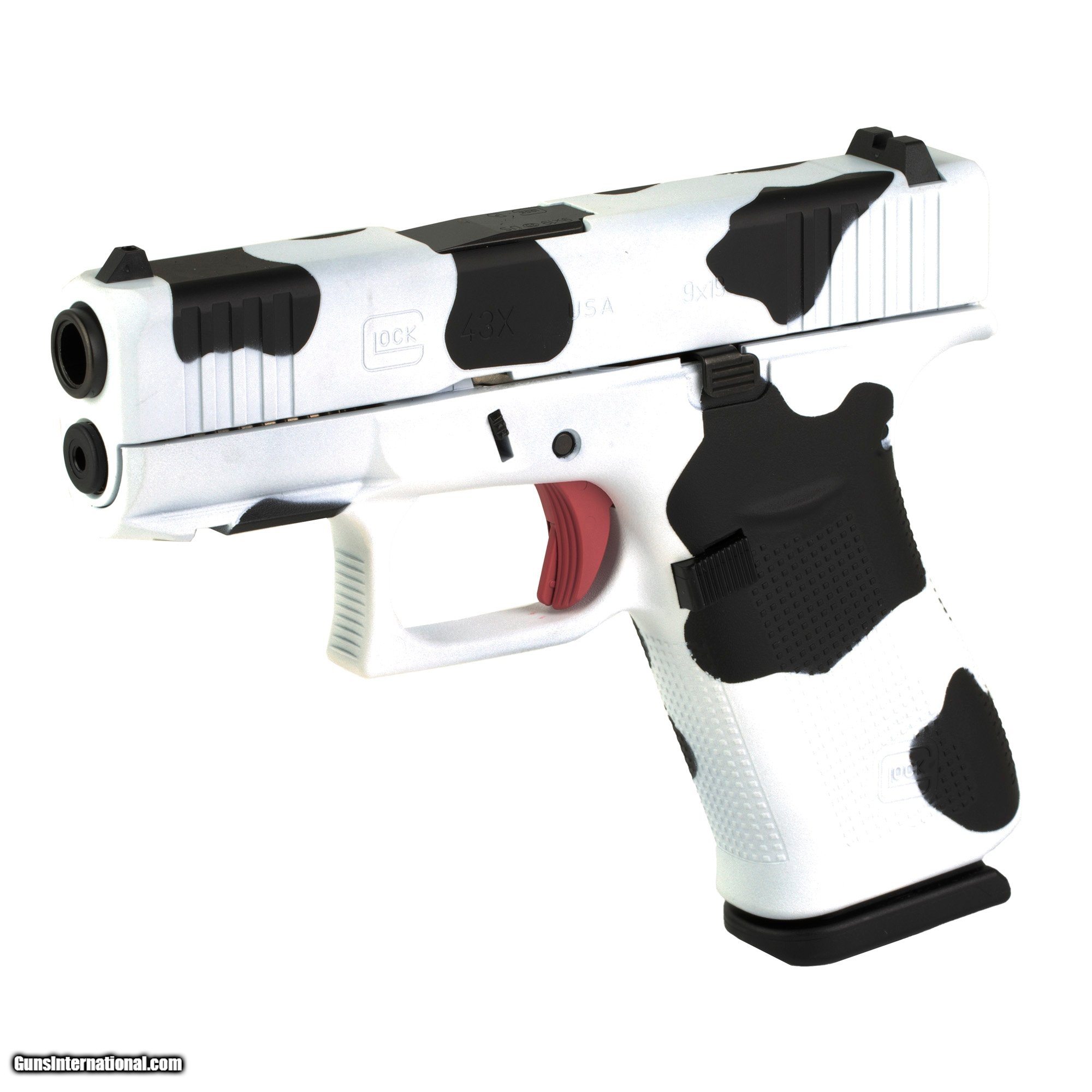 Description: Guns Listing ID: prod361097 The G43X is an upsized version of the popular micro-compact G43. The pistol features an enlarged grip that significantly improves handling and grip comfort while also increasing the magazine capacity to 10 rounds. The G43X also retains the compact barrel length of the G43 to ensure a quick and snag-free draw. This custom model features a unique Cow Print Cerakote finish provided by Skydas Gear. Two 10-round magazines are included. SOLD Manufacturer: GLOCK Model: G43X (SKYDAS CUSTOM) Caliber Info: 9MM LUGER (9X19 PARA) Condition: new Barrels: 3.41 BARREL Finish: CERAKOTE |
