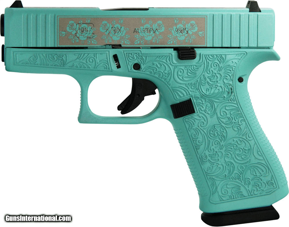 Description: Manufacturer: Glock Model: G43X Tiffany Blue Custom Engraved SKU: GLPX4350201GRP Caliber: 9mm Capacity: (2) 10 Round Magazines Barrel Length: 3.41" Frame: Cerakote Tiffany Blue, Full Scroll Engraving Grips: Cerakote Tiffany Blue Polymer with Scroll Engraving Slide: Cerakote Tiffany Blue with Engraved Roses on Sides and Top of Slide Overall Length: 6.5" Sights: Fixed Weight: 23.07 oz All items are factory new in box unless otherwise stated. Based on the information available to us, the above specifications describe this item to the best of our knowledge. For further information, please contact or visit the manufacturer's . SOLD |
