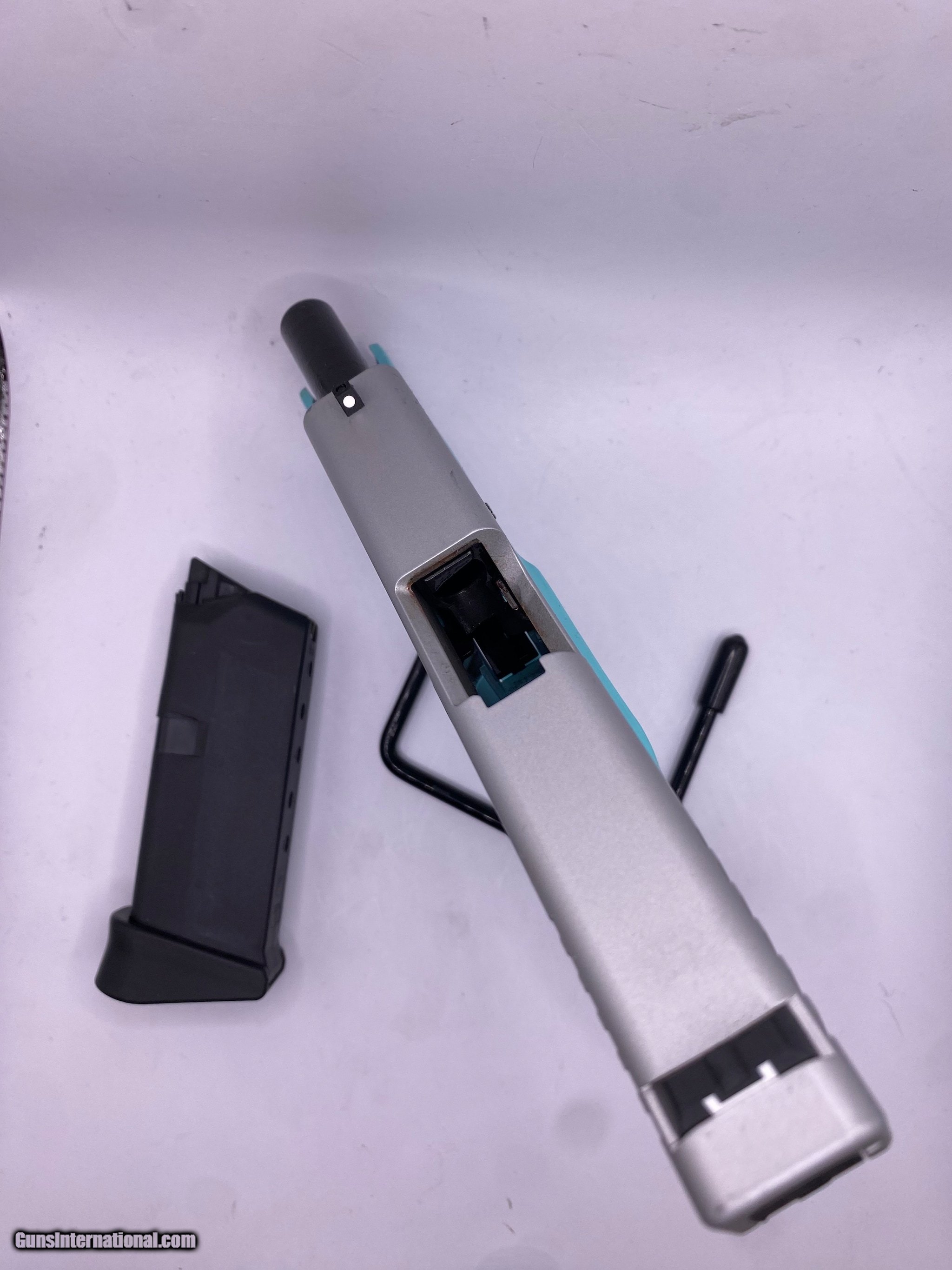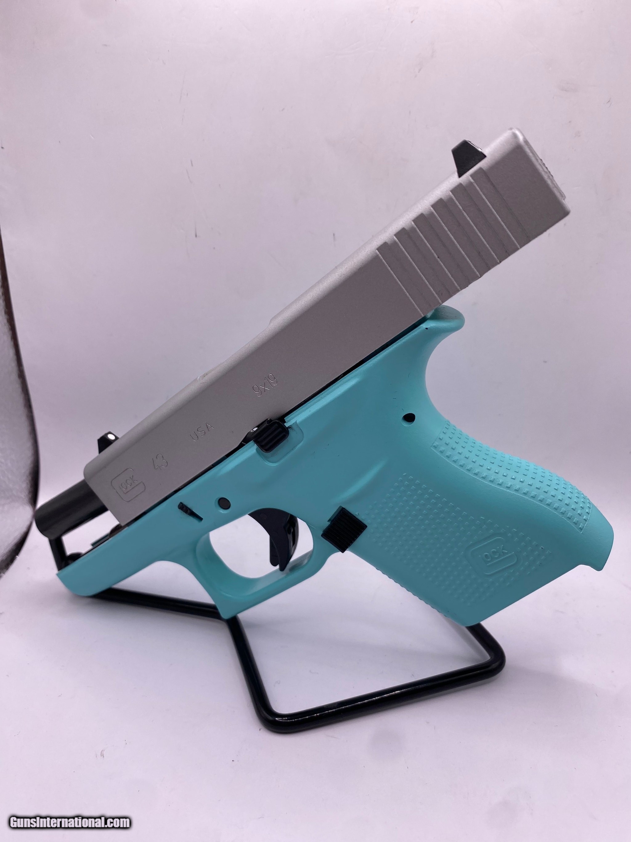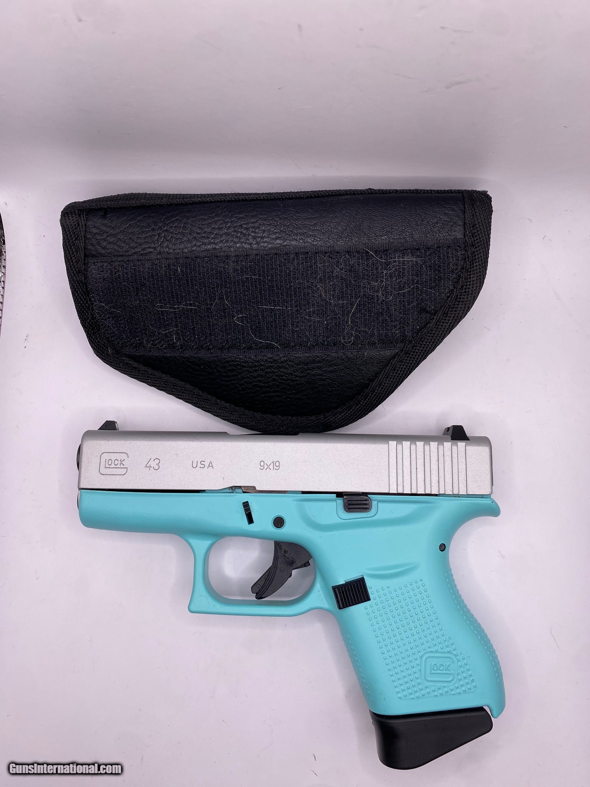Description: Guns Listing ID: 976559 Comes with soft pocket holster . Sights Fixed Glock Sights Weight 1.437lbs Cartridge 9mm Luger Features Slimline Frame Size Subcompact Hand Right Optics Ready Yes Overall Length 6.50in SOLD Manufacturer: GLOCK Model: GLOCK 43 Caliber Info: 9MM LUGER (9X19 PARA) Condition: Used - Non-Certified Barrels: 3.4 BARREL Finish: ROBIN‚‚S EGG BLU |