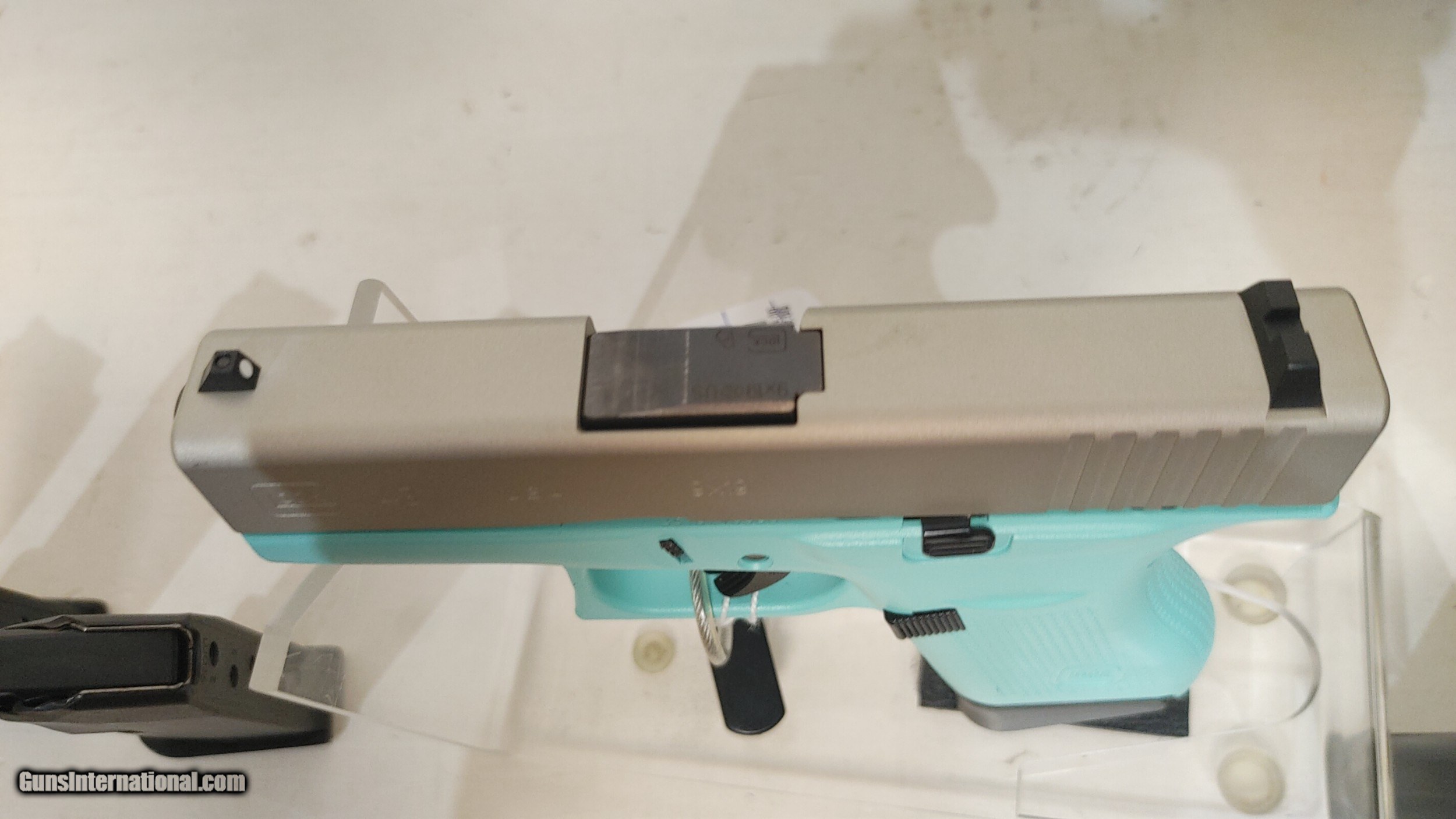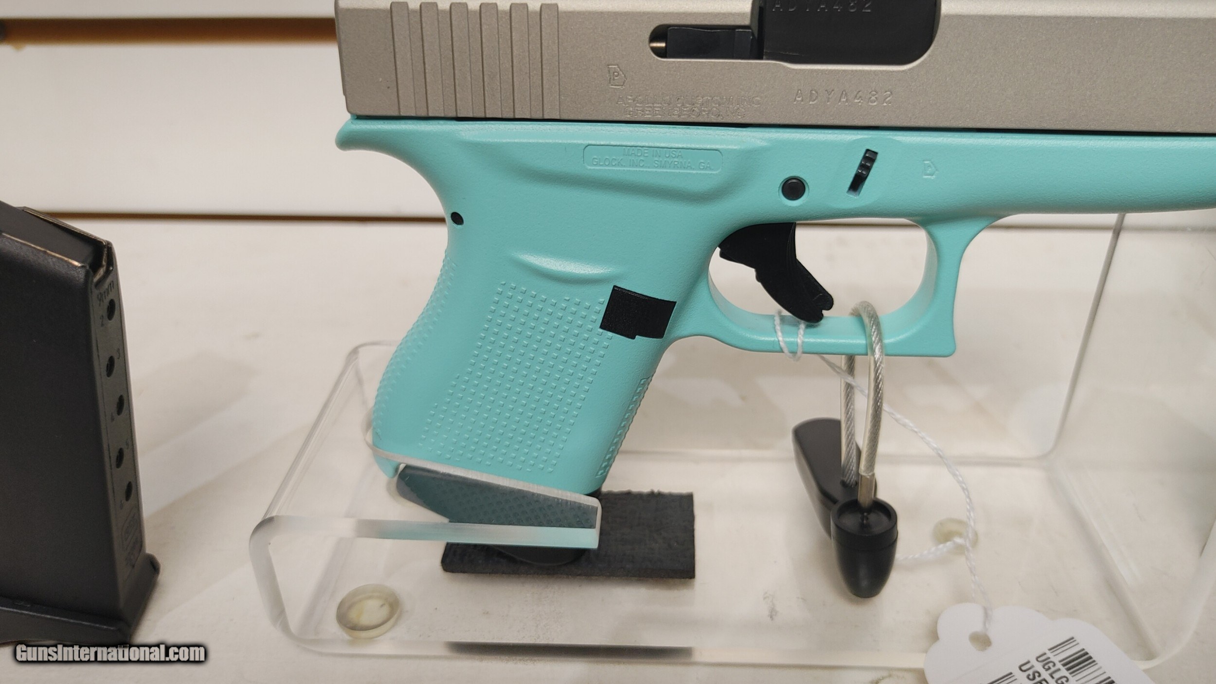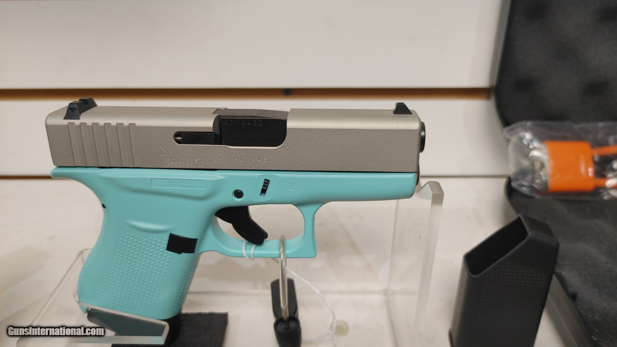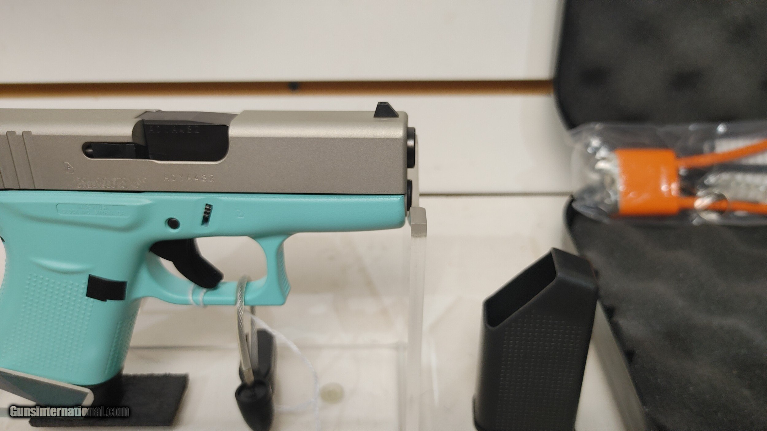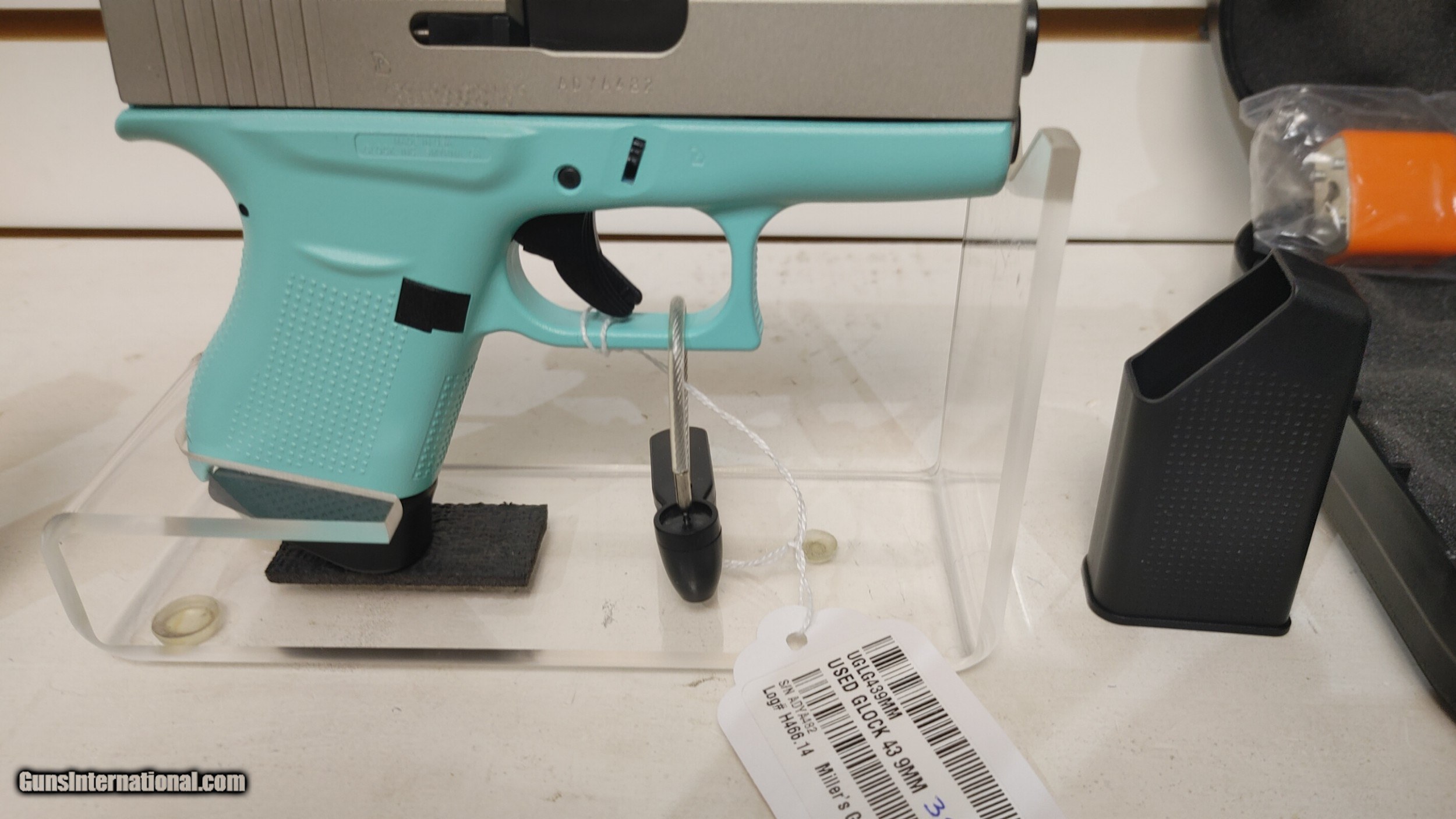 Description: Lightly used GLK 43 USA 9MM PST CKRESA 6RD used in original box (CALIBER:9MM); (MAG CAPACITY:6+1); (MODEL SERIES:43 USA); (CAPACITY:6+1); (FINISH:CERAKOTE SHIMMERING ALUMINUM); (STOCK:CERAKOTE ROBINS EGG BLUE); (SIGHTS:FT: WHITE DOT RR: WHITE OUTLINE); (OVERALL LENGTH:6.26); (FEATURES:APOLLO CUSTOM EDITION); (GUN TYPE:PISTOL: SEMI-AUTO); (ACTION:SAFE ACTION); (BARREL LENGTH:3.39) ;(DEPT:HANDGUN) 4 magazines Buyer pays shipping Millers Gun Center Located in New Castle, Delaware "Home of TAX-Free shopping" No Credit Card Fees Send Gun international inquiry and then call 302-328-9747 to complete your purchase SOLD Serial Number: ADYA482 |