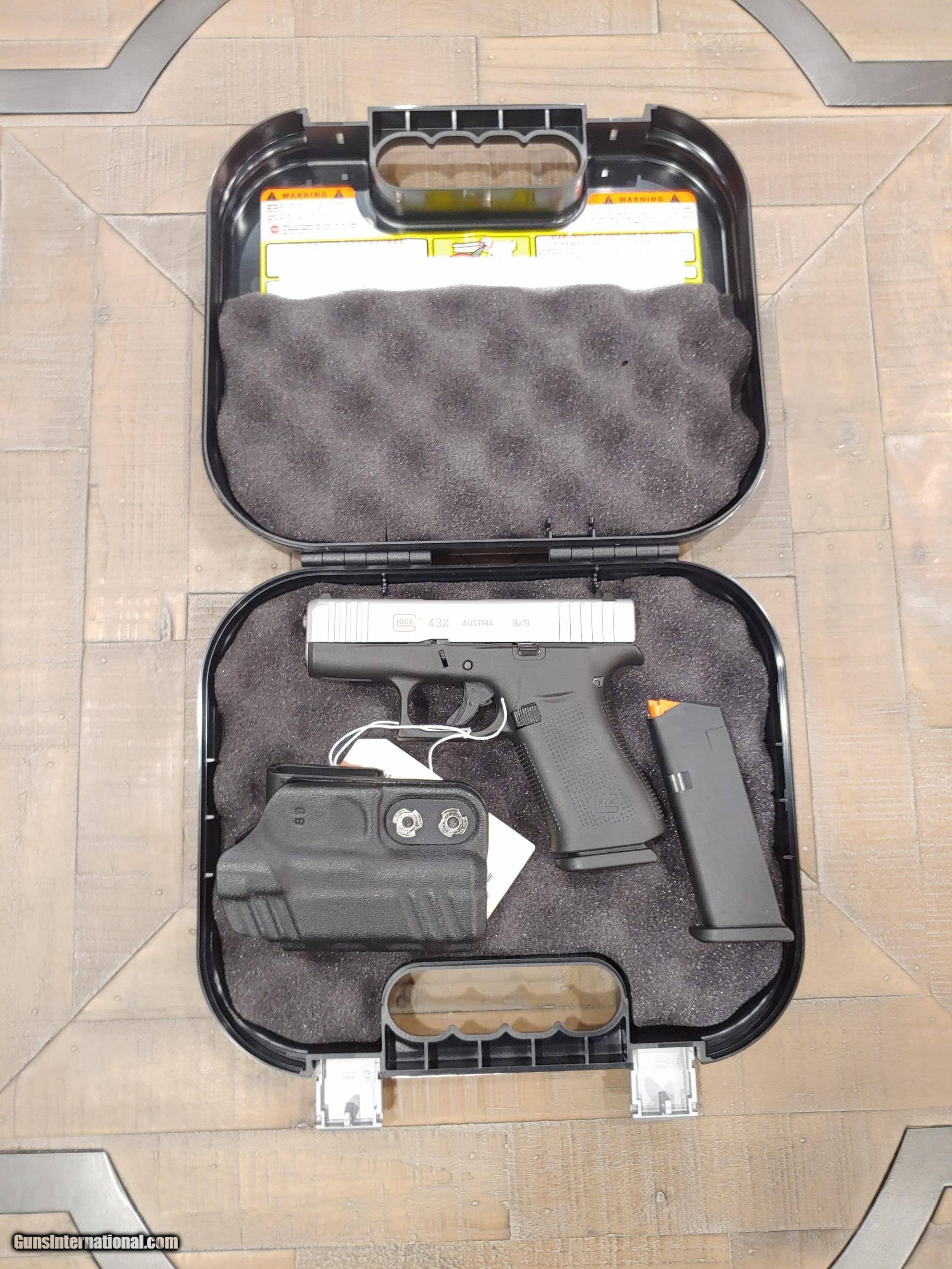 Description: Chambered in 9mm Luger the G43X features a compact Slimline frame and the 10-round magazine capacity makes it ideal for concealed carry. Designed for comfort, The G43X combines a compact-size grip length, a built-in beaver tail, and a subcompact-slim slide for a comfortably balanced, versatile grip that´s ideal for a variety of users. The frame incorporates elements of the Gen5 and Slimline series such as the short trigger distance, a frame with a built-in beavertail, a reversible magazine catch, and the incredibly accurate, match-grade GLOCK Marksman Barrel (GMB) and precision-milled front serrations. Comes with 2 magazines, a case, and a holster. Has some scratches on the slide but is in otherwise great condition.