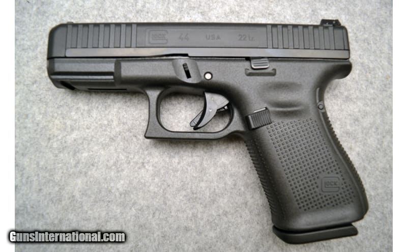 Description: This Glock Model 44 is a right hand semi-auto pistol in .22 Long Rifle Cal. It has a 4 inch barrel with a front and rear serrated slide. A blade front sight and notch rear sight with white highlights. The grip is a textured black polymer with changeable backstraps. It has a lower accessory rail. Includes hard case and two magazines. .22 Long Rifle SOLD Barrels: 4 Weight: 14 oz. Item Location: christiana |
