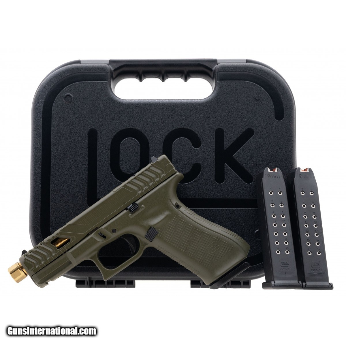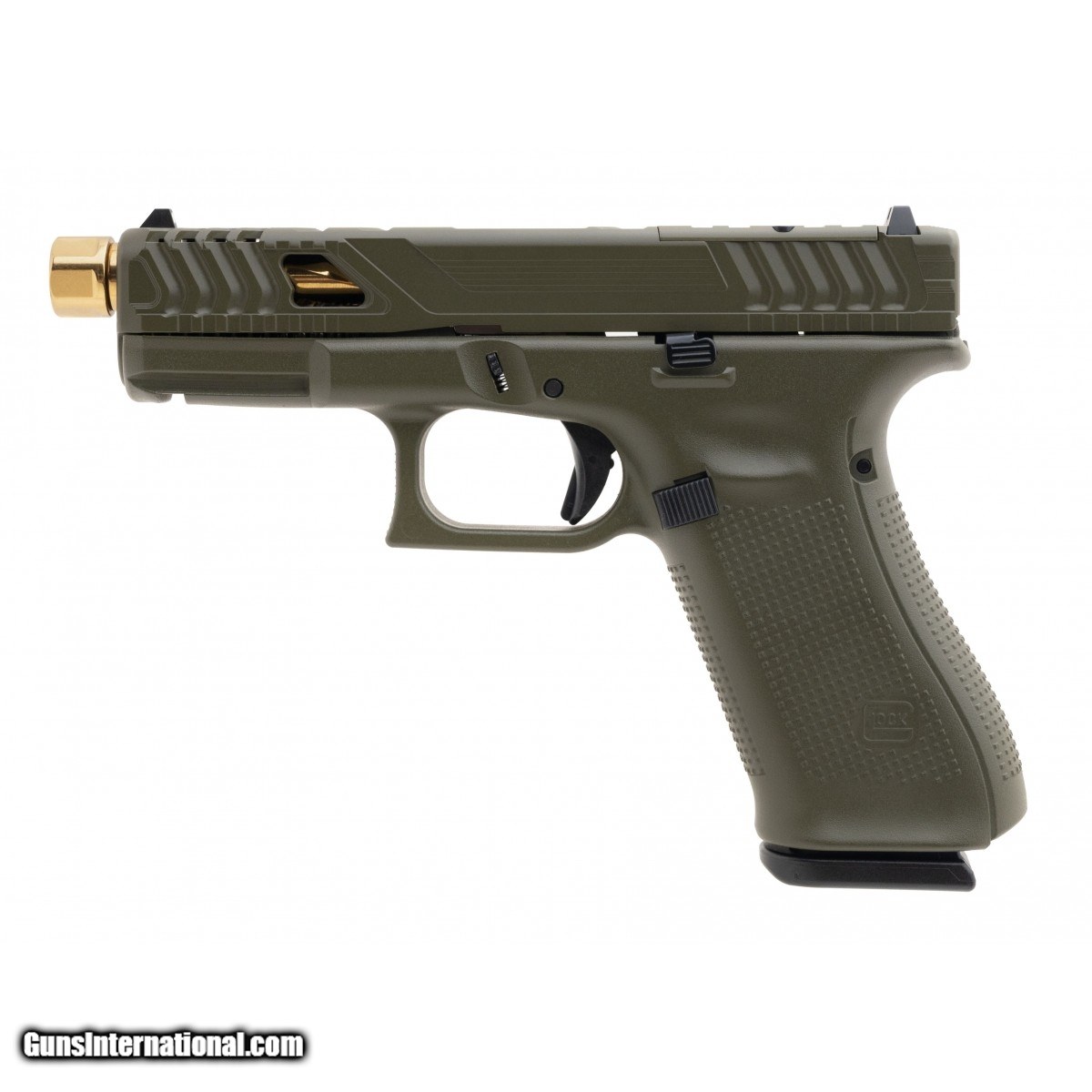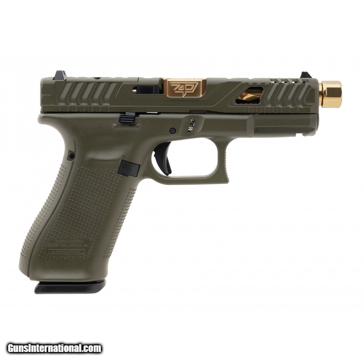 Duty size handgun with a 4.6"" Zaffari gold threaded barrel, optic ready OD green custom slide, front-rear serrations and polymer frame. NEW. UPC: 688099401573.