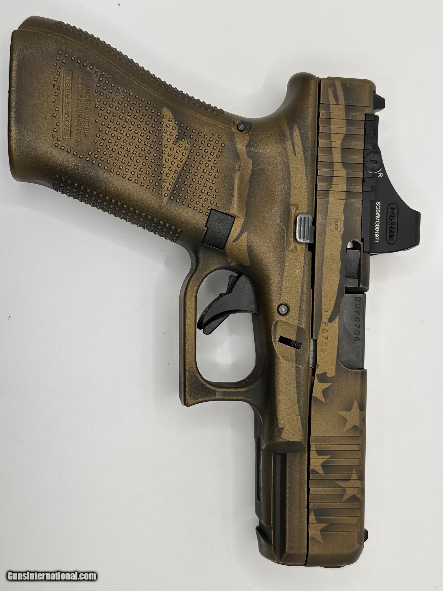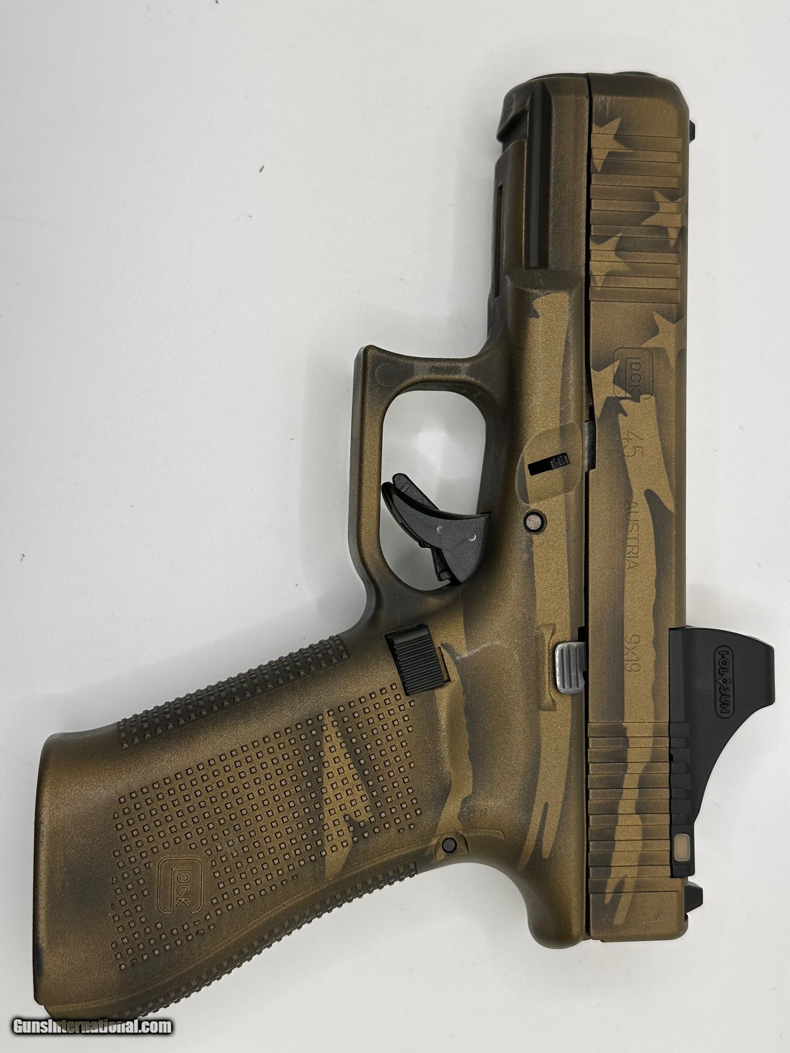 Description: Guns Listing ID: 485754 Very good condition American flag distressed FDE Cerakoted Glock 45 with a Holosun SCS multi reticle green dot mounted on top. Comes with one mag. SOLD Manufacturer: GLOCK Model: 45 Caliber Info: 9MM LUGER (9x19 PARA) Condition: Used - Non-Certified Barrels: 4 Finish: a-tacs camo / burnt bronze cerakote |