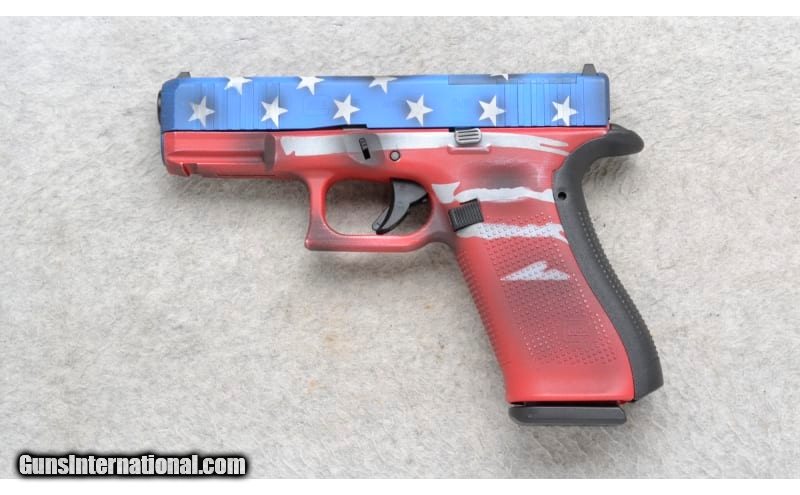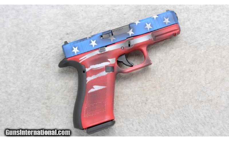 Description: This Glock Model 45 American Flag theme is a right hand semi-auto pistol in 9mm Cal. It has a 4 inch barrel with a front and rear serrated slide. A blade front sight and notch rear sight with white highlights. The grip is a textured polymer. 9mm Parabellum SOLD Chambers: 17 round magazine. Metal Condition: Excellent. Bore Condition: Excellent. Barrels: 4 inch barrel with a front and rear serrated slide. Weight: 24 oz. Sights: Blade front. Notch rear. White highlights. Item Location: Richfield, WI |