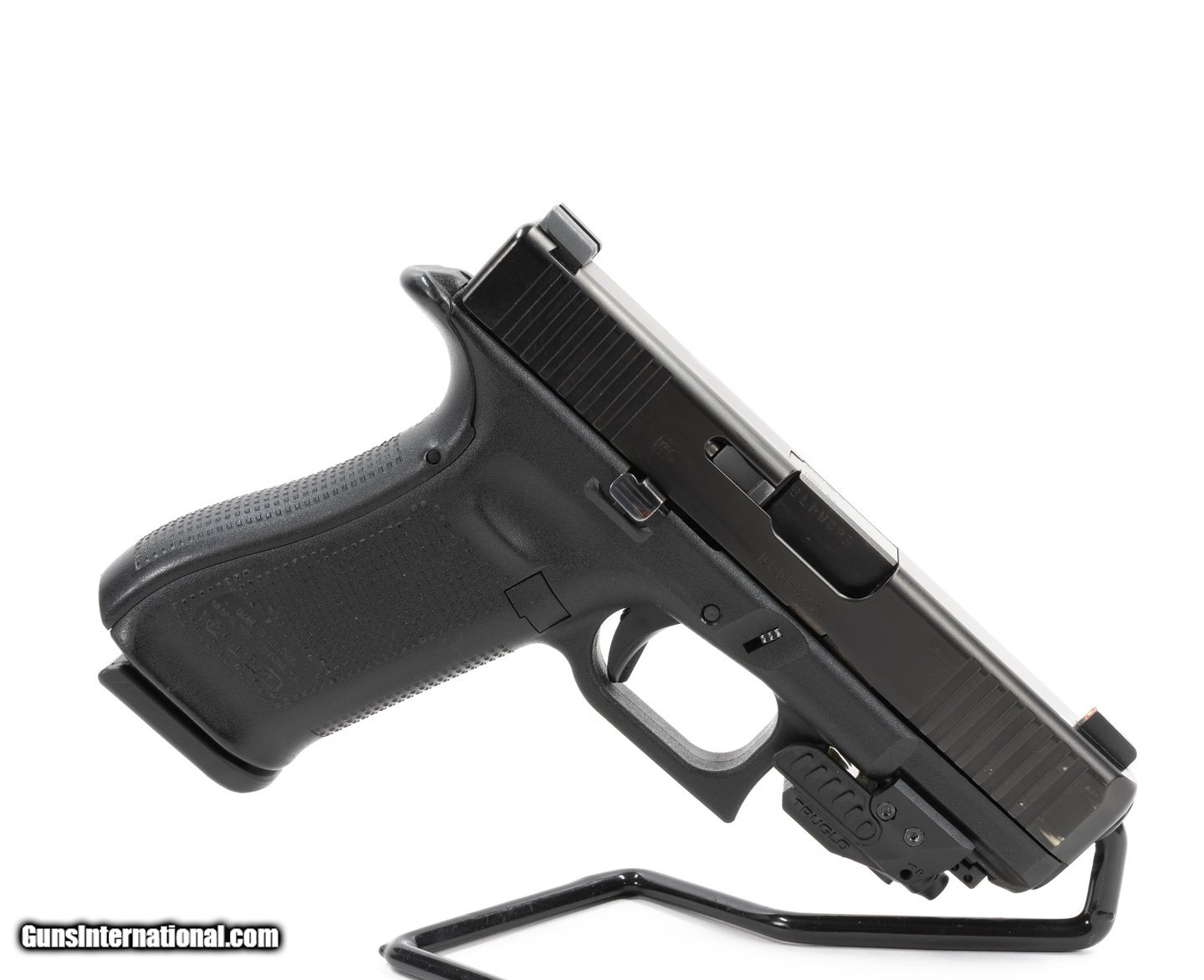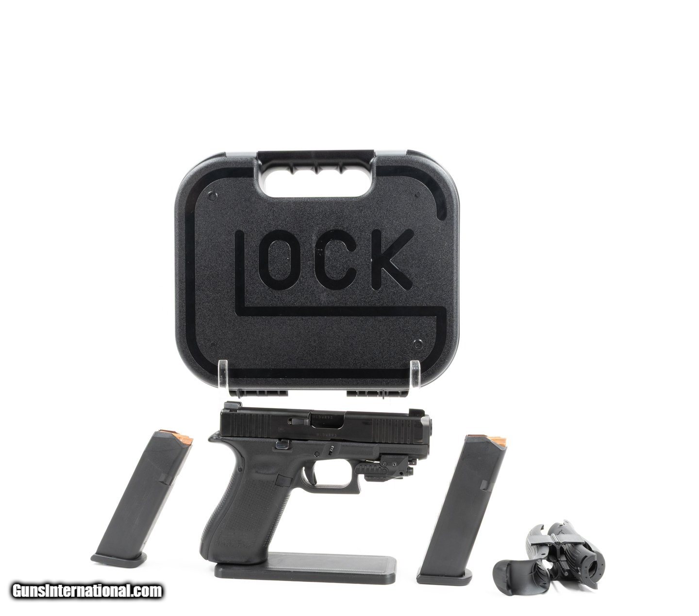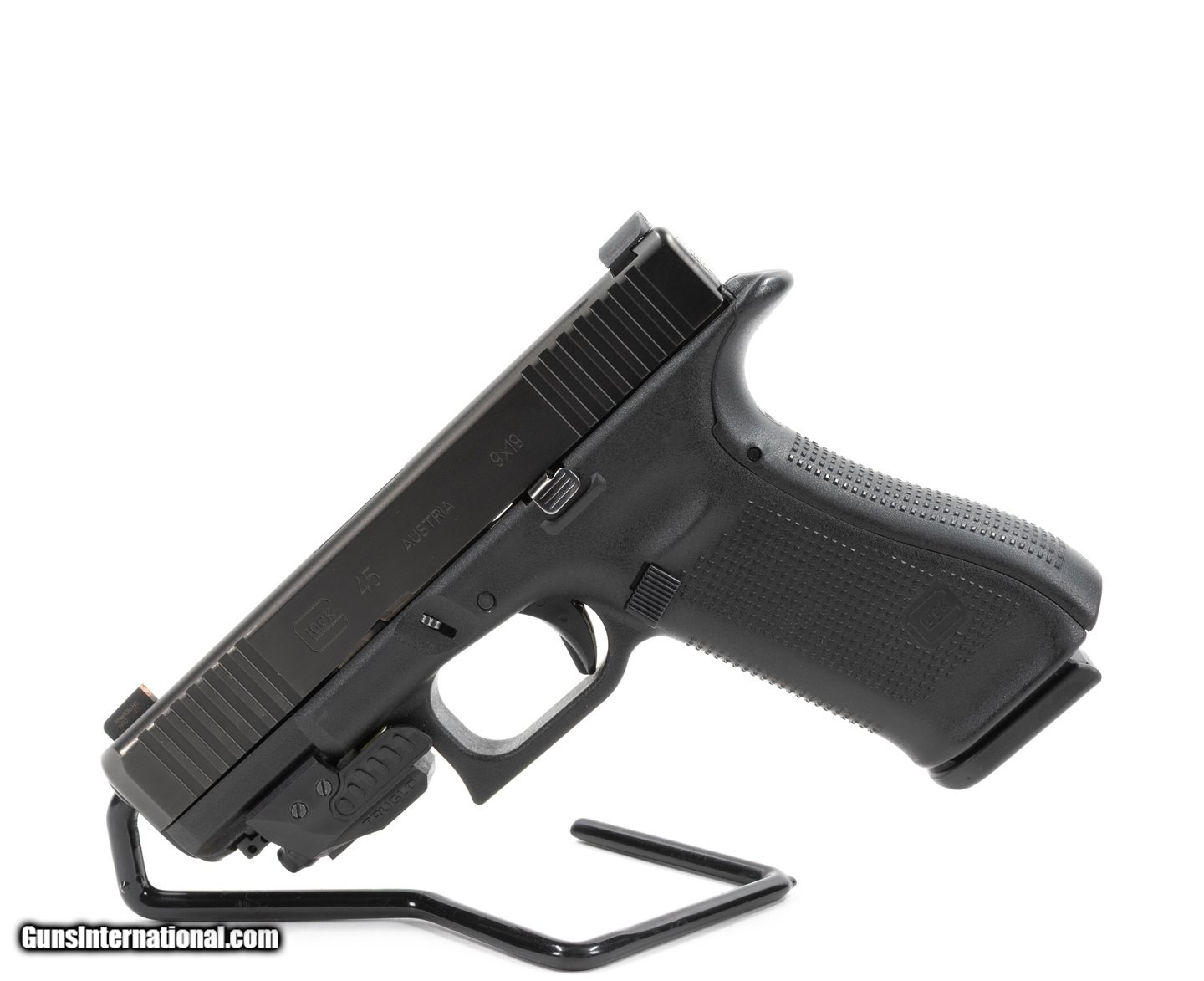 Description: Guns Listing ID: 527239 Glock 45 Gen 5 9mm 17+1 w/ Truglo Laser & Case Manufacturer: Glock Model: G45 Gen5 Condition: Very good Caliber: 9x19mm Action: Semi-Auto / Striker Fired Barrel Length: 4.02\" Capacity: 17+1 Sights: TruGlo night sights Size: Compact crossover Origin: Austria Laser: TruGlow red laser, ambi controls Other Features: Front & rear slide serrations, flared magwell, accessory rail. Inventory: Firearm, (2) 17-rd magazines, extra backstraps, original hard case. UPC: 764503030970 • Please be aware that we have not test fired this gun. Unless otherwise stated, expect this firearm to fire and function safely. SOLD Manufacturer: GLOCK Model: G45 Gen5 Caliber Info: 9MM LUGER (9x19 PARA) Condition: Used - Non-Certified Barrels: 4.02 Action: SEMI AUTOMATIC Finish: black |