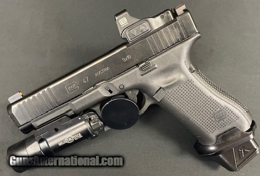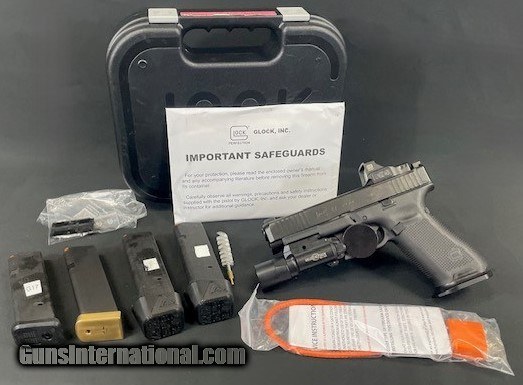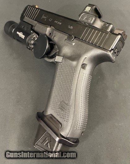 Description: Guns Listing ID: 577551 Glock PA475S203MOS G47 Gen5 MOS Full Size 9mm Luger 17+1 4.49\" Black GMB Barrel, Black nDLC MOS Cut/Serrated Slide, Black Polymer Frame w/Picatinny Rail, Black Textured w/Interchangeable Backstrap Grip, Ambidextrous Comes with case, Eotech Red dot, Surefire x300, McNally competition trigger, Safariland holster, 1-17rd mag, 5-21rd mags, 3 magazine pouches, Night Sights The G47 Gen5 features flared magwell has a larger funnel; Glock Marksman Barrel (GMB) more aggressive polygonal rifling with a target-style crown and tighter chamber specs; ambidextrous slide stop levers offer increased ergonomics for left-hand shooters and shooting with the support hand; removal of finger grooves; Safe Action System, safeties disengage sequentially as the trigger is pulled and automatically re-engage when the trigger is released; enlarged floor plate makes it easier to pull the magazine free of the pistol and customizable frame size with backstraps in two sizes with beavertail. The multiple backstrap frame allows the users to change the circumference of the grip to fit their individual hand size. *Note- The G48 with the Modular Optic System (MOS) does not come with adapter plates. Includes one adapter plate, three magazines, mag loader, cleaning kit, pistol case and gun lock. Brand Glock Category Pistols Series Gen5 MOS Model G47 Caliber 9mm Luger Barrel Length Range 4\" to 4.99\" Gun Platform Glock Component Compatible Capacity 17+1 Action DAO Frame Finish Black OAL 7.95\" Frame Material Polymer Hand Ambidextrous Sight Style Fixed Slide Finish Black nDLC Slide Material Steel Slide Description Optic Ready / Serrated Barrel Finish Black Barrel Material Steel Frame Size Full Size Grips Interchangeable Backstrap Trigger Pull Weight 5.50 lbs Height 5.47\" Safety Firing Pin / Trigger Block Width 1.34\" Barrel Description GMB Barrel Length 4.49\" Max Capacity 17 Weight 34.29 oz Frame Description Polymer Frame w / Picatinny Rail Manufacturer: GLOCK Model: G47 MOS Caliber Info: 9MM LUGER (9X19 PARA) Condition: Used - Non-Certified Barrels: 4.49" BARREL Action: STRIKER FIRED Finish: BLACK Weight: 1.62 LBS. Price: $1,392.99 Contact Seller |