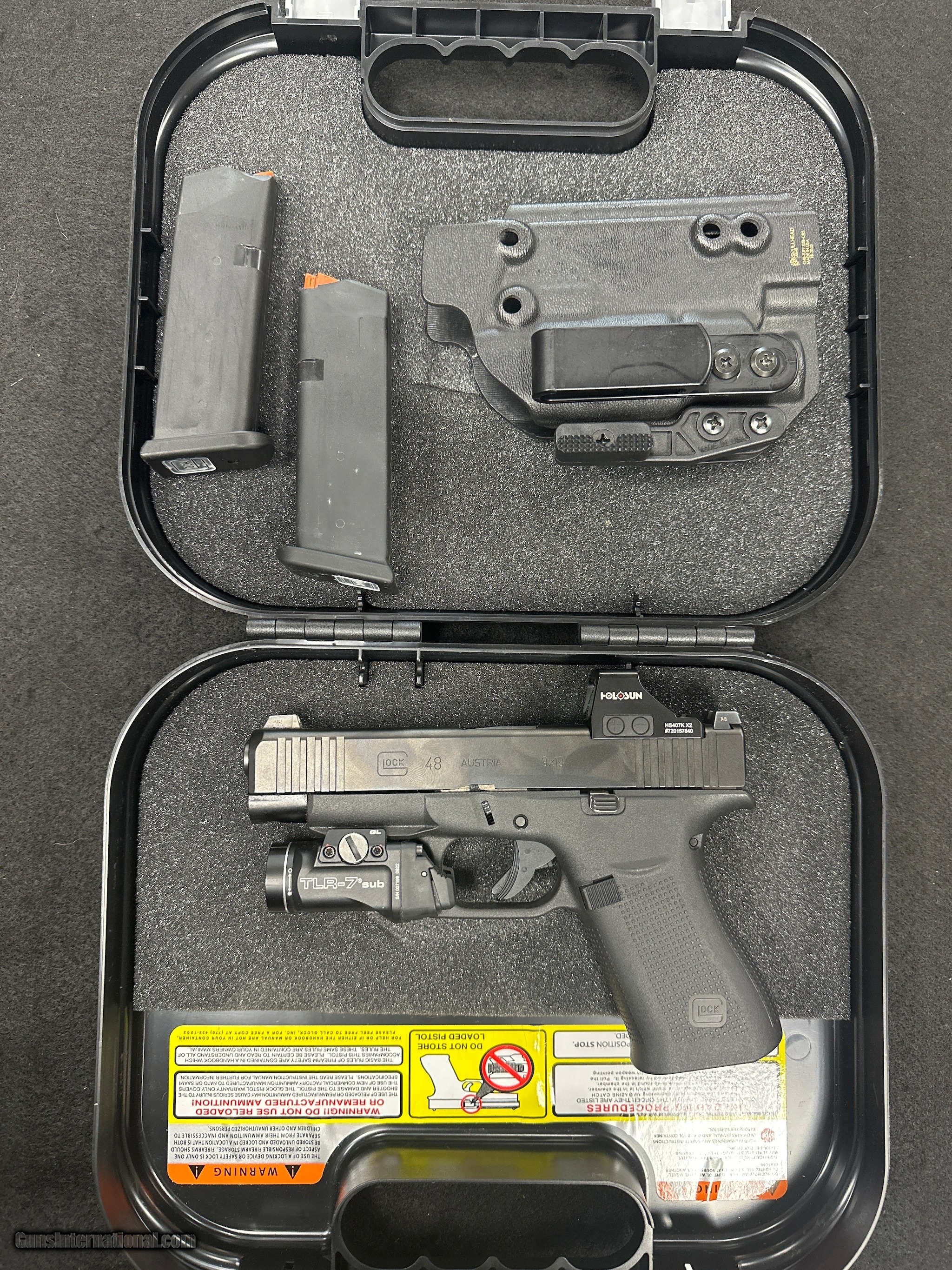 Description: Guns Listing ID: 1001334 Up for sale is this preowned Glock 48 MOS. This item comes with 2 mags, the original case, holster, TLR-7 sub Flashlight, and Holosun HS470K X2! This firearm is nice! It’s in great overall condition with all accessories working as designed. This item ships as pictured within one business day of your payment! Thank you for viewing our listing. SOLD Manufacturer: GLOCK Model: 48 MOS Caliber Info: 9MM LUGER (9X19 PARA) Condition: Used - Non-Certified Barrels: 3 BARREL Finish: BLACK |