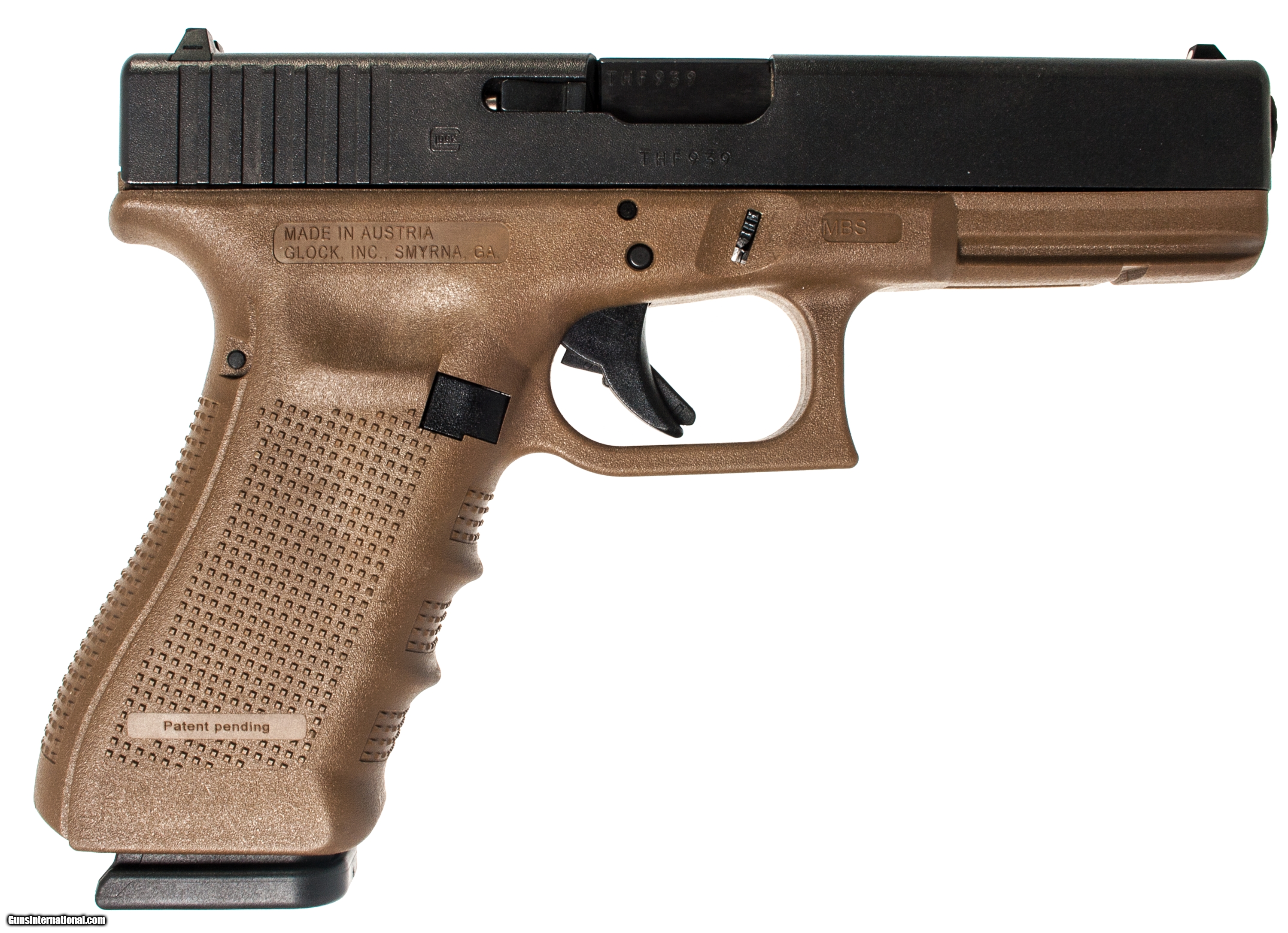 Glock 17 Gen 4 chambered in 9 mm with a 4.5 inch barrel bi-tone (FDE frame with a black slide) as case and 2 extra magazines. This gun is in excellent condition and is covered by Dury's Lifetime Warranty.