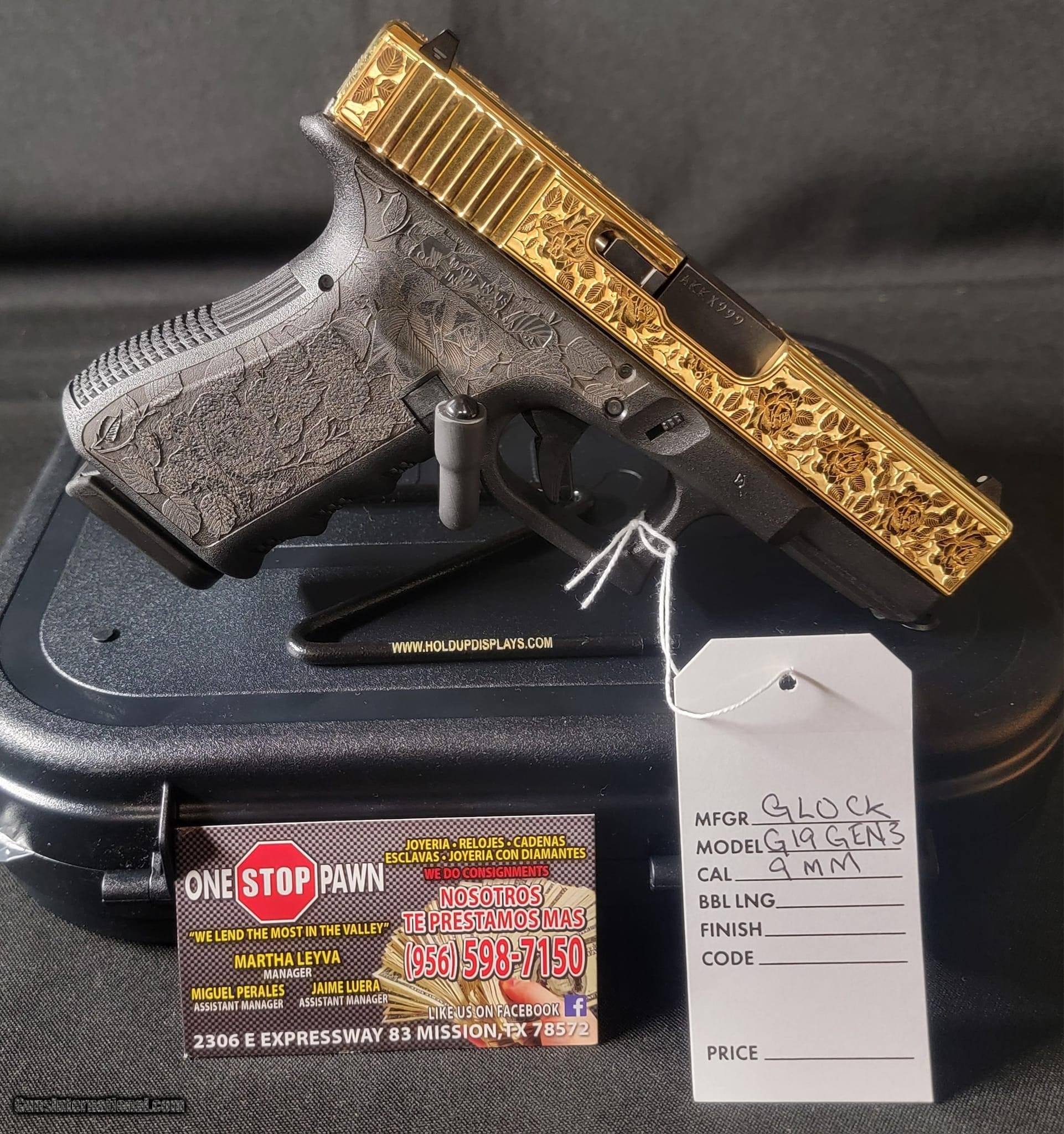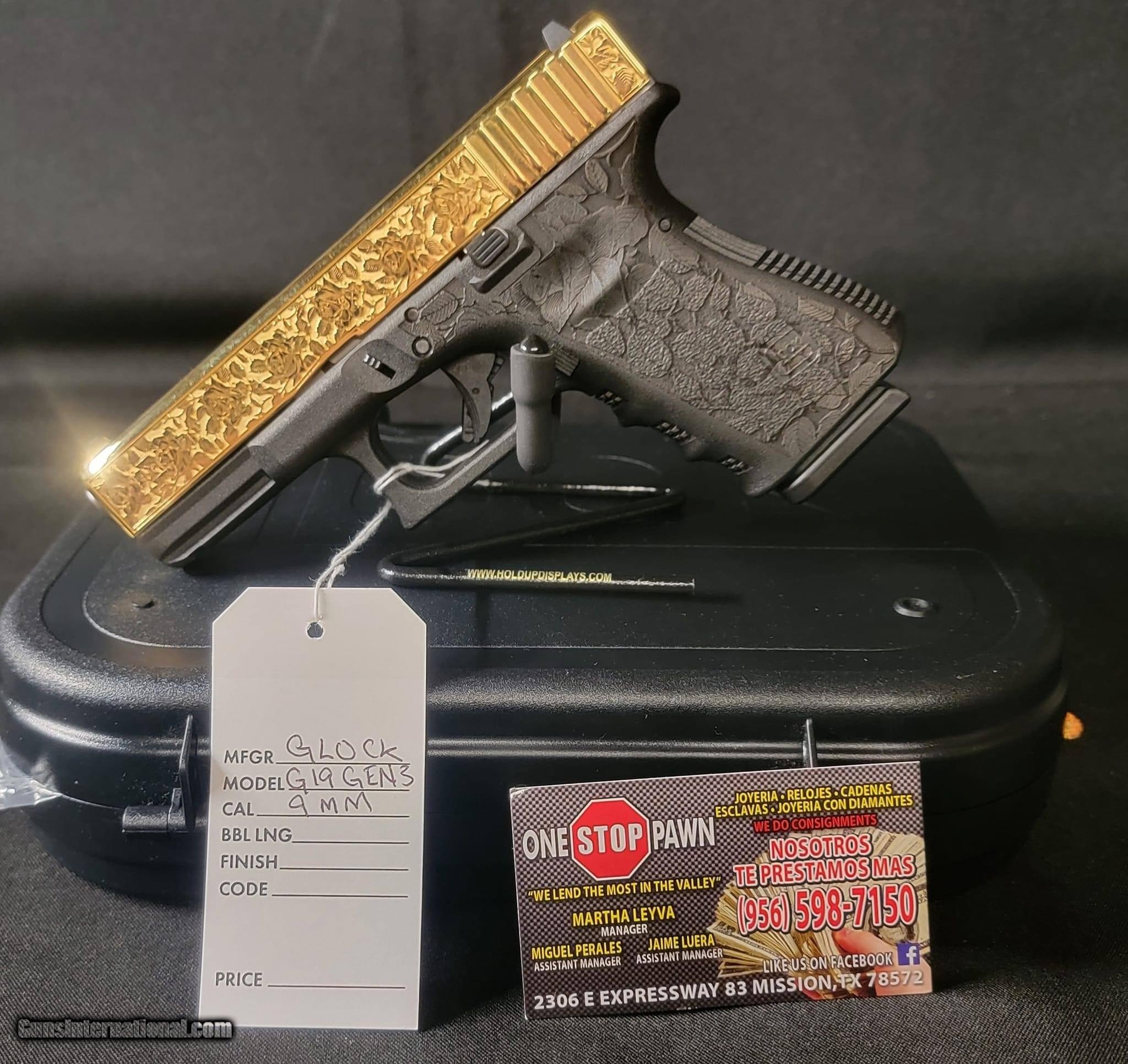 Description: Guns Listing ID: 1171065 PRE OWNED 24K GOLD PLATED ENGRAVED FROM SLIDE AND FRAME ROSE DESIGN 1 MAG IN GLOCK CASE SOLD Manufacturer: GLOCK Model: 19 Gen 3 Caliber Info: 9MM LUGER (9X19 PARA) Condition: Used - Non-Certified Barrels: 4 BARREL Finish: GOLD PLATED |