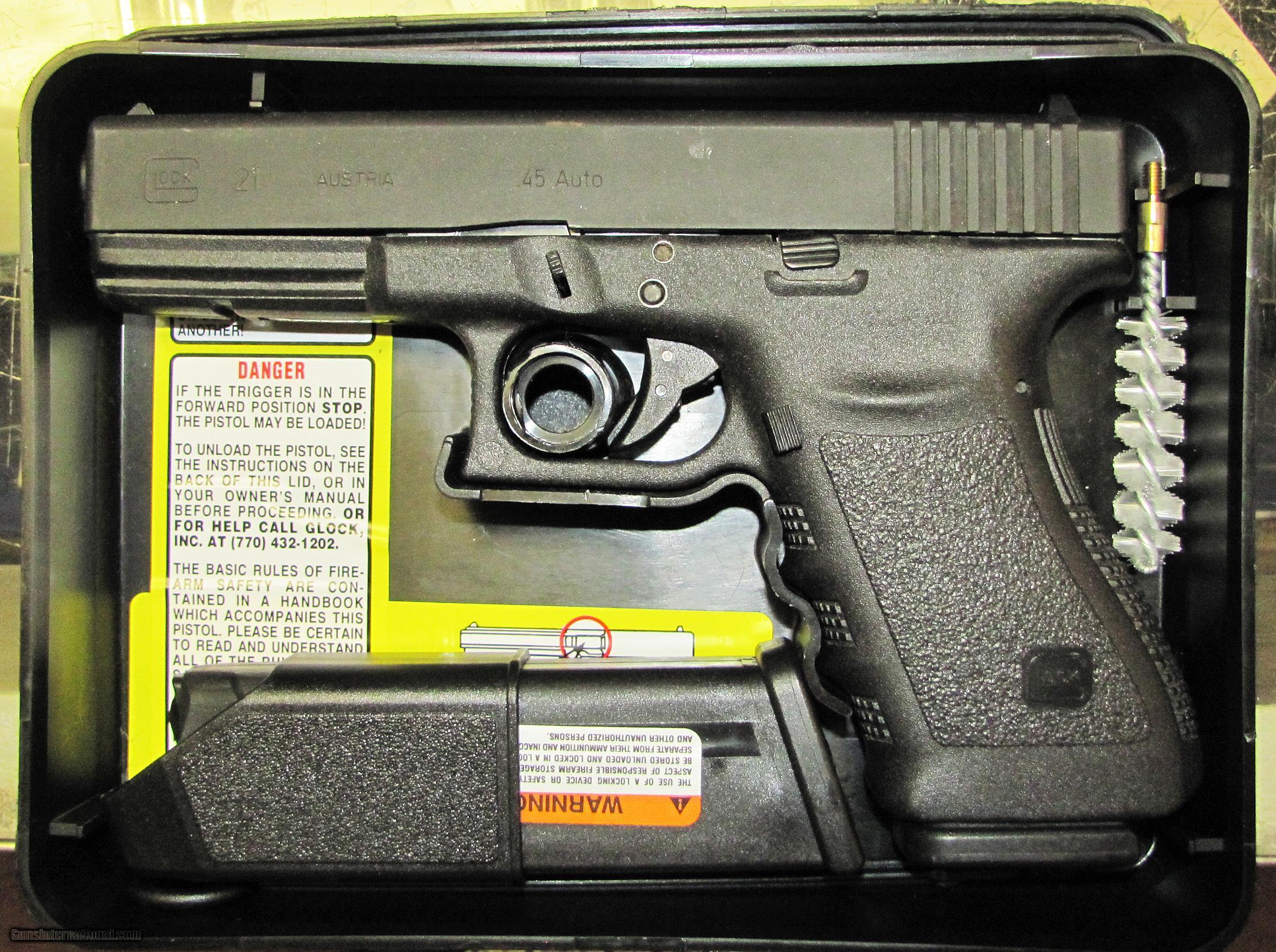 Description: GLOCK 21 IN .45 ACP CAL., WITH 4 1/2" BARREL. COLOR MATTE. CONDITION 98% LIKE NEW. SERIAL NUMBER DES757US. GLOCK MODEL 21, MIRROR BORE, EXCELLENT GRIPS, FACTORY BOX WITH ACCESSORIES, COMES WITH TWO TEN ROUND FACTORY MAGAZINES, LIKE NEW CONDITION. OUR NEW STOCK # D31024. SOLD |