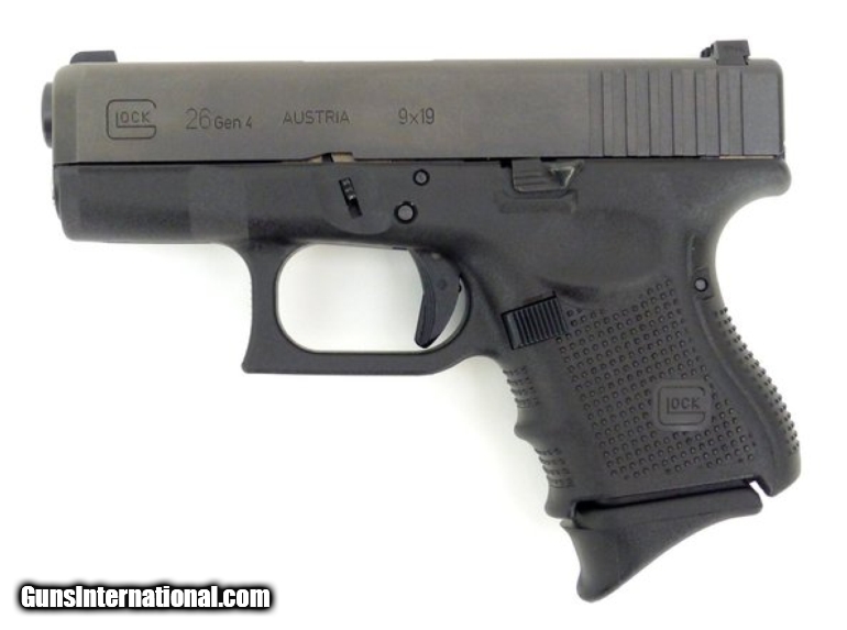 Glock 26 Gen 4 9mm caliber pistol. Subcompact model with night sights and upgraded guide rod in excellent condition.