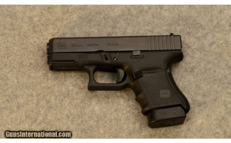 Description: This is a pre-owned Glock 30 Gen 4. SOLD Caliber Info: .45 Auto. Metal Condition: Excellent condition. Wood Condition: Excellent condition. Bore Condition: Clean with bright lands. Barrels: 3.77 inch. Stock: Textured polymer. Weight: 1 3/4 lbs. Sights: Fixed sights. Extras: Comes with the factory case, 3 factory 10 round magazines, manual, padlock, and 4 extra back straps. Item Location: Glendale, AZ |