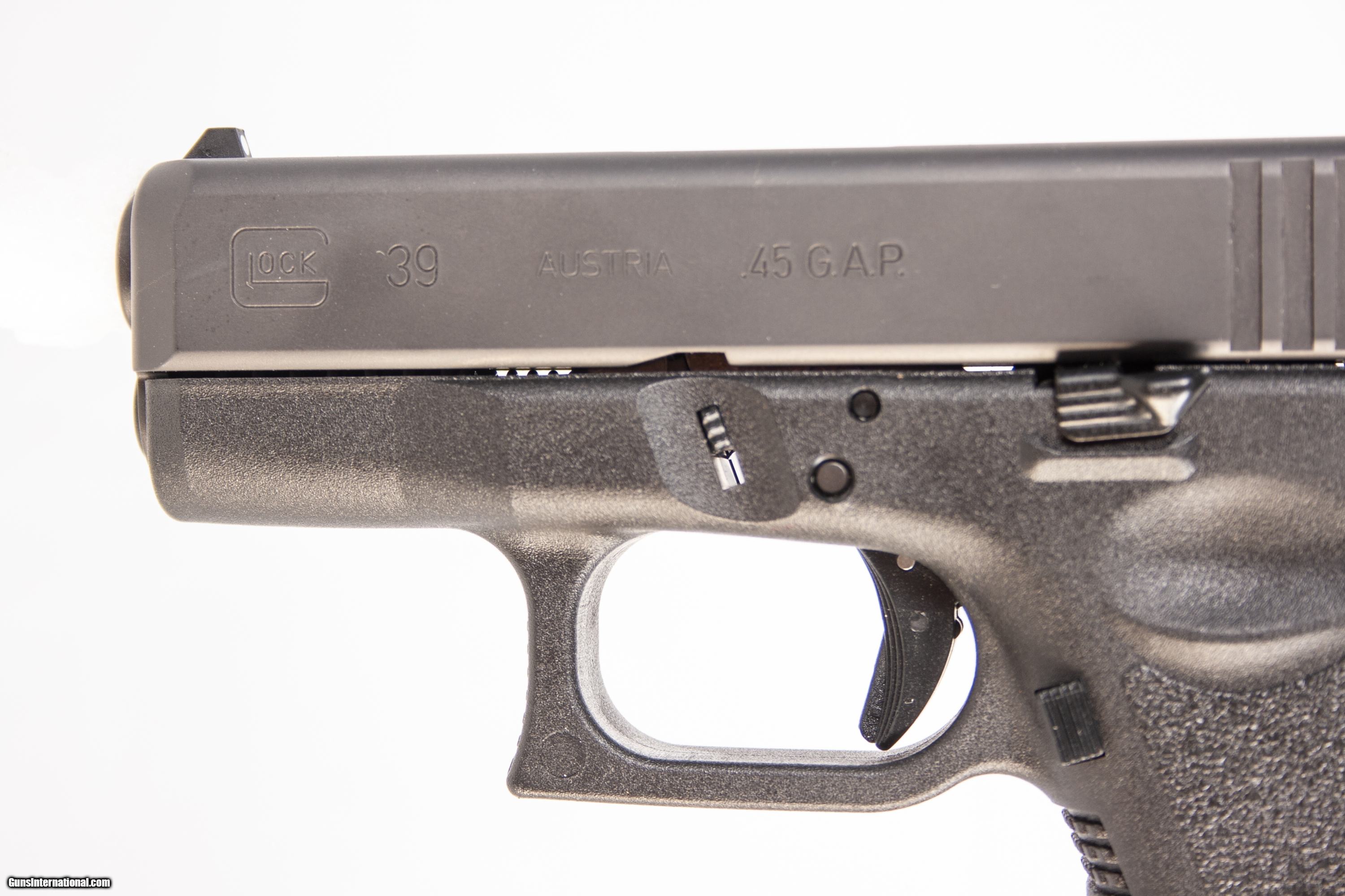 Description: Glock 39 chambered in .45 GAP with a 3 1/2 inch barrel bright bore good grooves. This gun is in excellent condition and is covered by Dury's Lifetime Warranty.