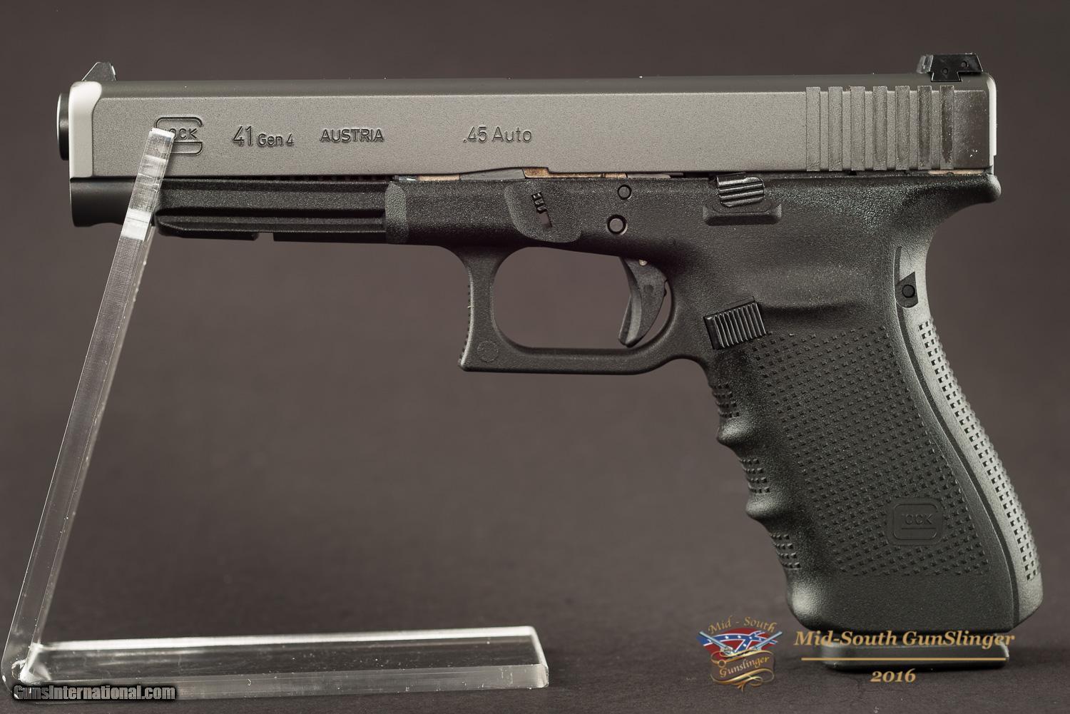Description: Presented for sale, you will find a Glock Model 41 generation 4 chambered for 45 ACP ammunition This pistol came to us from an estate. It appears to be new but I cannot be certain. This pistol has seen little if any use, The images illustrate this pistol better than I can describe. Included in the listing is the illustrated Glock 41 Gen 4, three (3) thirteen (13) round magazines, Magazine loader, two extra sets of grips, cleaning rod, cleaning brush, ramrod, test cartridge, warranty card and instruction manual. This pistol will ship via FedEx Standard Overnight to the lower 48 for $49.95. Thank you for looking. Our phones are answered 24/7 by a human that speaks English. Mid-South GunSlinger Will Sell Your Guns for You!!!