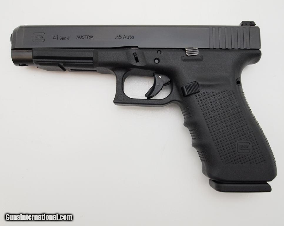 Description: Glock 41 Gen 4 Wbox .45 ACP, 5" bbl, bright shiny bore, strong rifling, black finish, adjustable white outlined horseshoe rear sight, white dot front sight, and textured grips. This pistol is in excellent condition. Add 3% for Credit Card Shipping $25.00 SOLD |