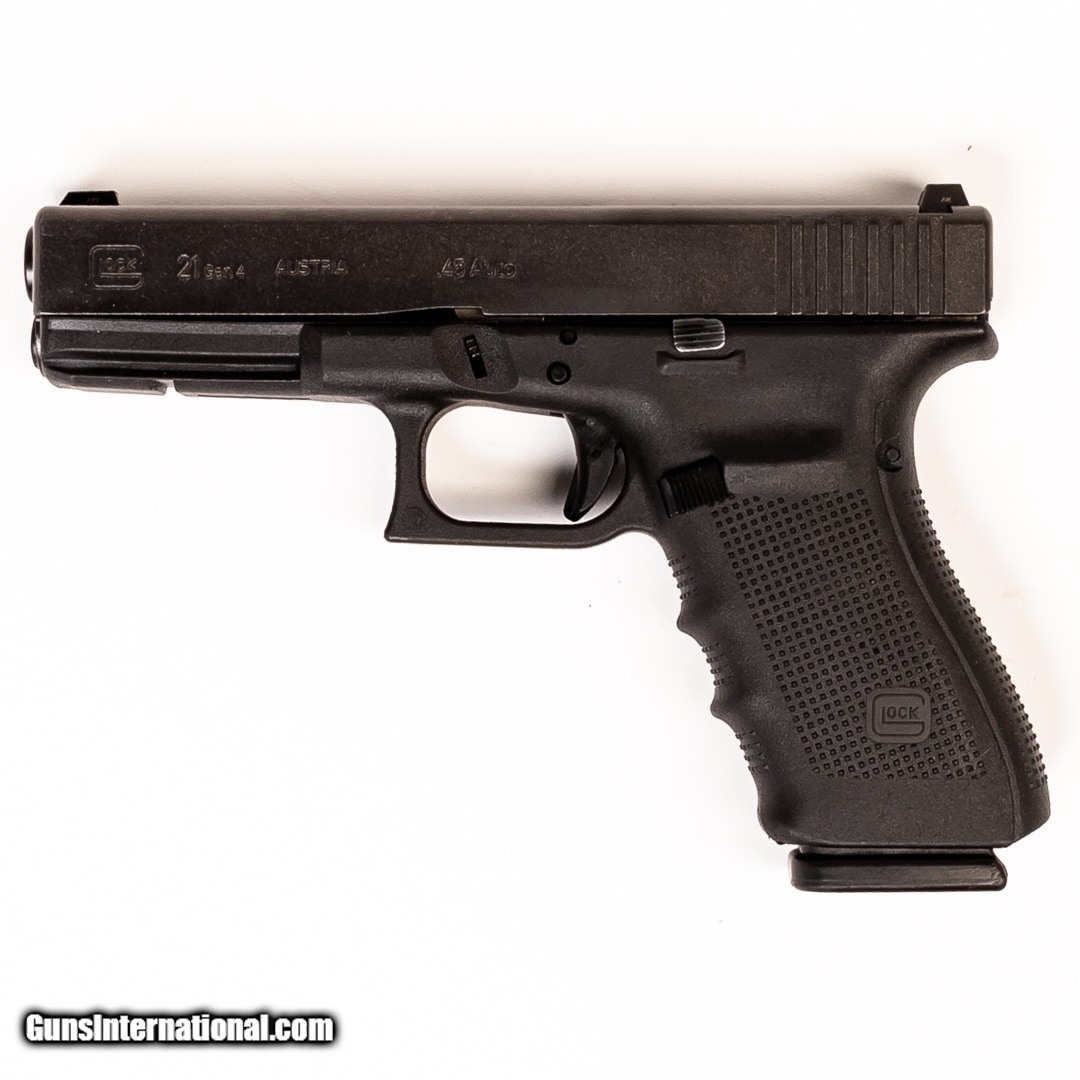 Description: Guns Listing ID: 463546 The Glock 21 is a full-size handgun chambered in 45 ACP. Perfect for duty use, self-defense, and tactical applications, the G21 has a legendary reputation for being solid and dependable. It features Glock‚‚s Safe Action Trigger and uses double stack magazines. This Glock G21 Gen 4 is in excellent condition SOLD Manufacturer: GLOCK Model: G21 GEN4 Caliber Info: .45 ACP Condition: Used - Certified Barrels: 4.6 BARREL Finish: BLACK |