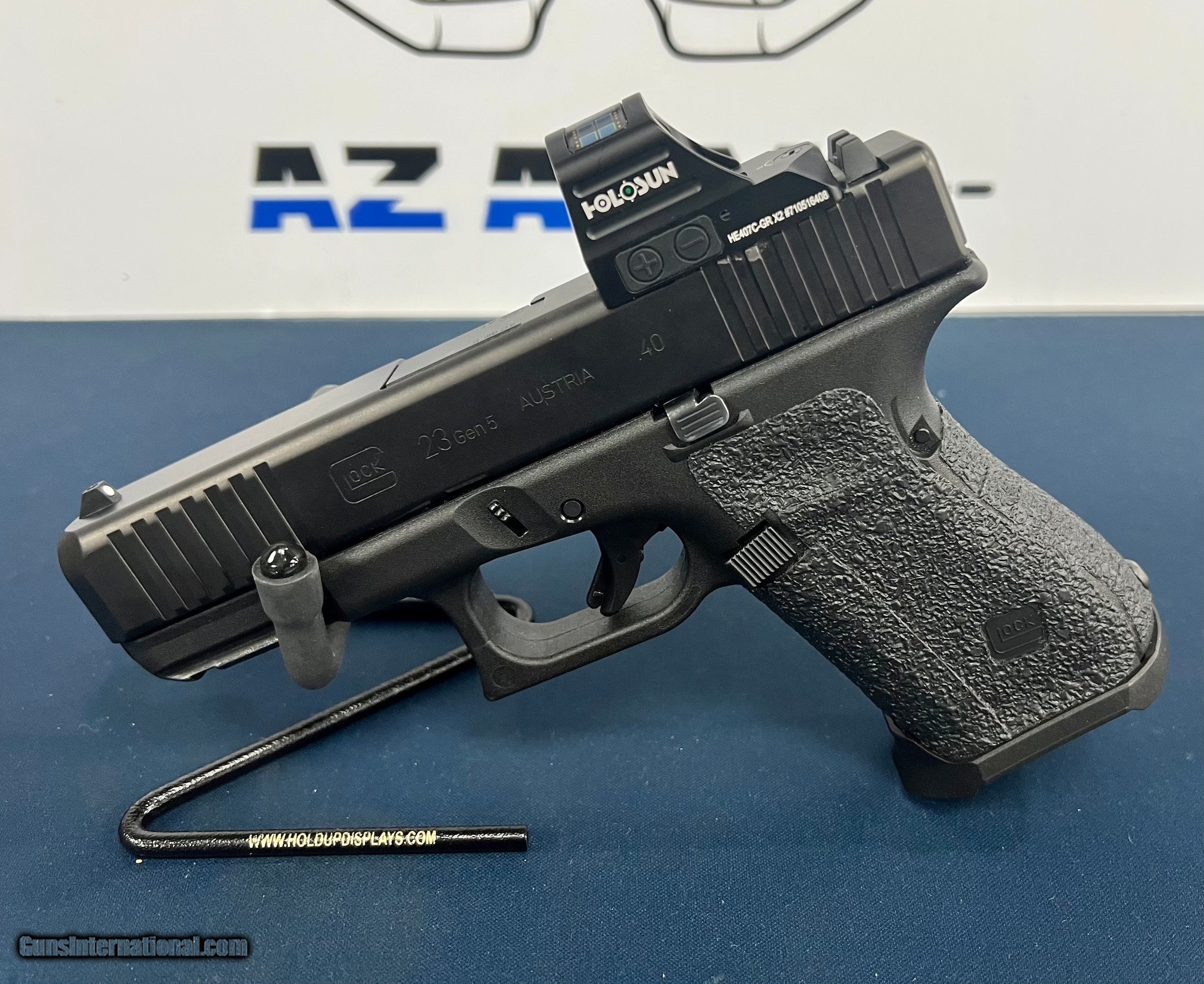 Description: Guns Listing ID: 715005 Glock 23 Gen 5. Includes Strike Industries flared magwell and magazine extension, a Talon grip and a Holosun 407C-GR optic. Has three 13 round magazines and two back straps. Comes with original box. SOLD Manufacturer: GLOCK Model: G23 Blue Label Gen 5 Caliber Info: .40 S&W Condition: Used - Non-Certified Barrels: 4.49" barrel Finish: BLACK |