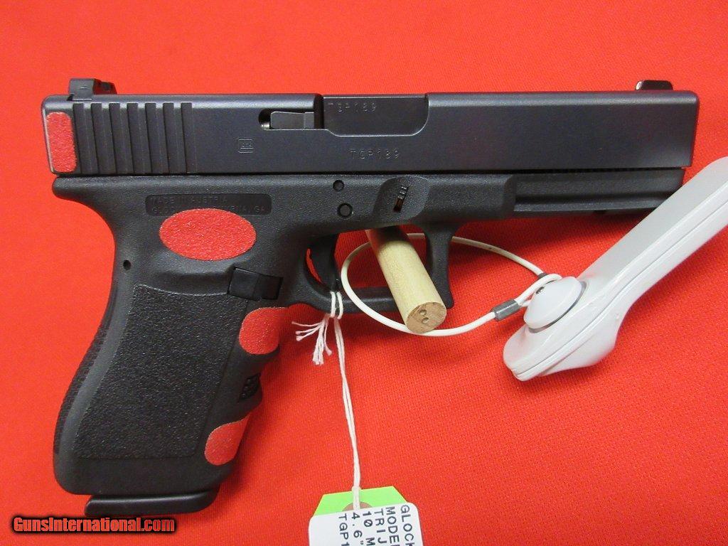 Description: Glock Model 20 10mm 4.6" Trijicon Night Sights (USED)-- Gen 3 pistol with upgraded Trijicon fromt and rear night sights, red grip tape has been added to the contours of the frame and the rear of the slide (it can be removed easily if wanted), comes with two magazines , the factory case, and paper work. SOLD |