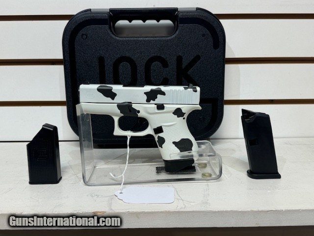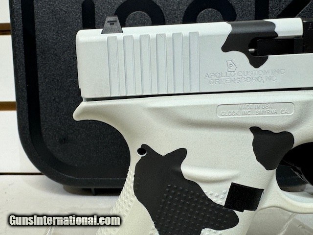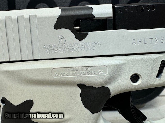 Description: UPC: 850016570895 Description: GLK 43 9MM 6R B&W CK SA Brand: Apollo Custom|Glock Model: 43 Black & White Type: Pistol: Semi-Auto Caliber: 9MM Finish: Cerakote Cow Pattern Action: Safe Action Stock: Cerakote Sight: FT: White Dot RR: White Outline Barrel Length: 3.41 Overall Length: 6.26 Weight: 16.9 oz Capacity: 6+1 # of Mags: |/23| Safety: Safe Action - 3 Separate Automatic Safeties Receiver: Cerakote Packaging: Black Plastic Case Features: Apollo Custom Edition, Cow Pattern; Made in the USA, Cleaning Rod and Brush MSRP: $639.99 Buyer pays shipping Millers Gun Center Located in New Castle, Delaware "Home of TAX-Free shopping" No Credit Card Fees Send Gun international inquiry and then call 302-328-9747 to complete your purchase SOLD Handgun Caliber: 9x19mm Parabellum (9mm Luger, 9x19mm NATO) Manufacturer: Glock Model: 43 Serial Number: AHLT263 |