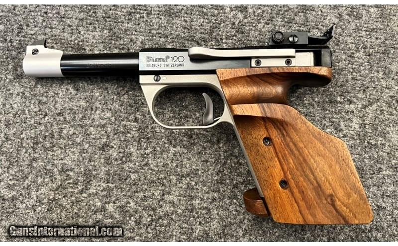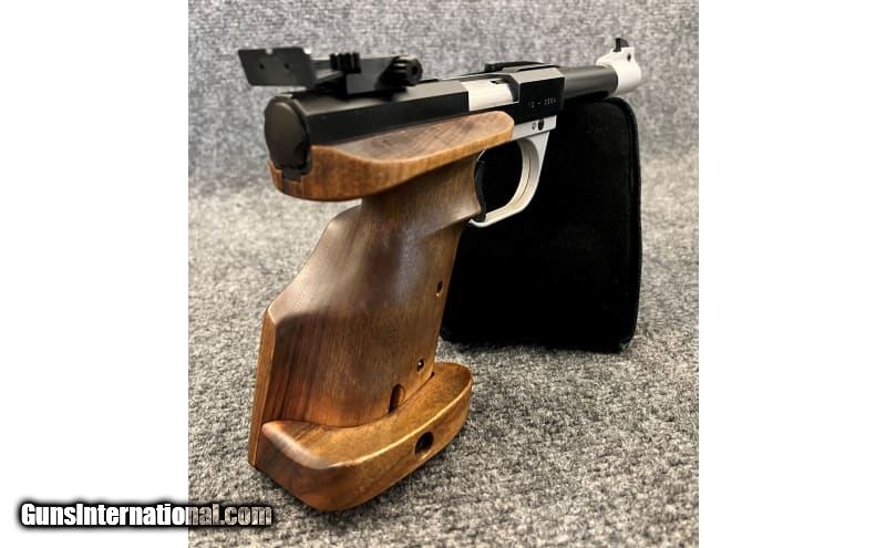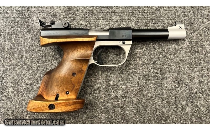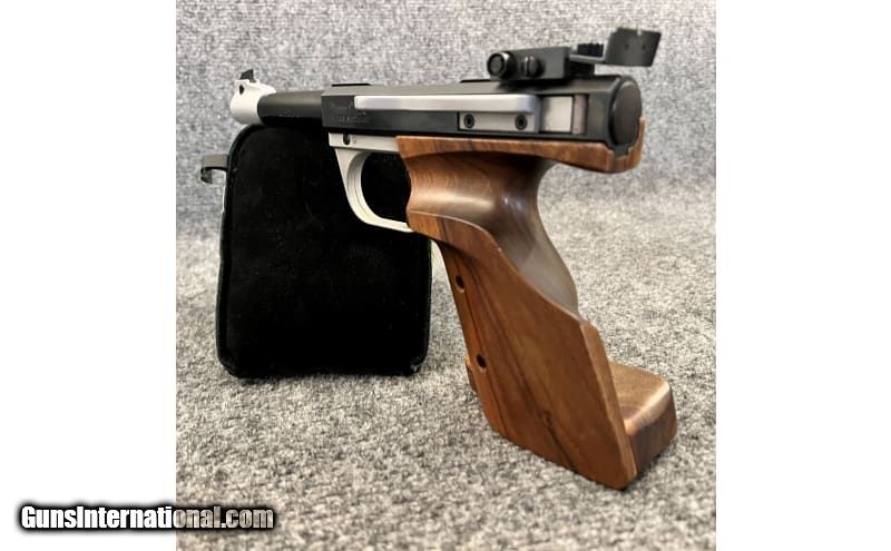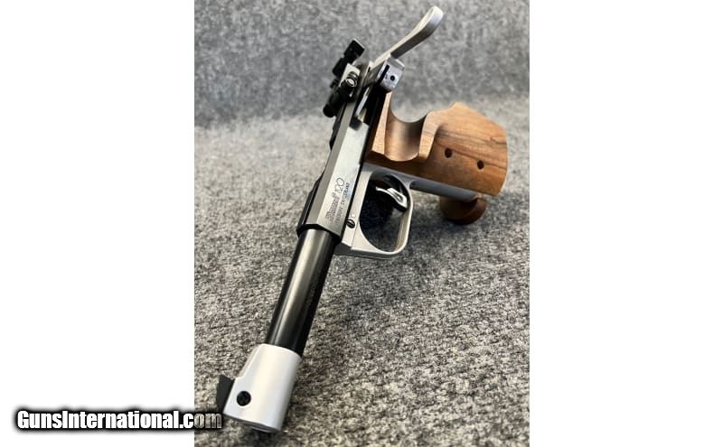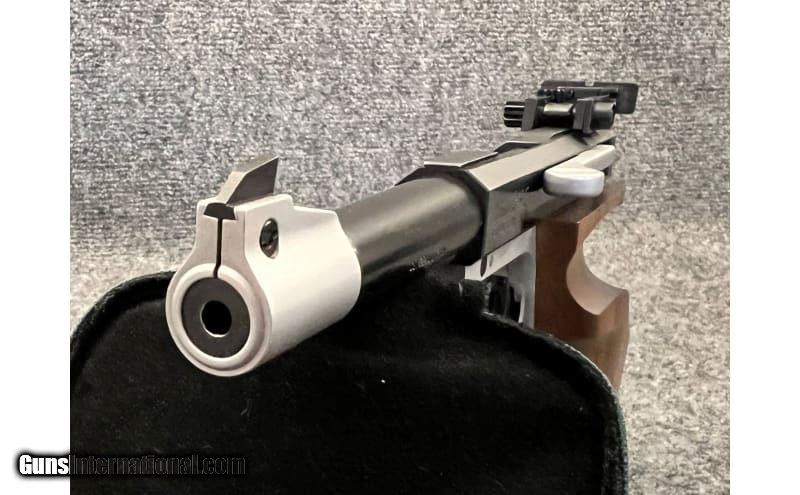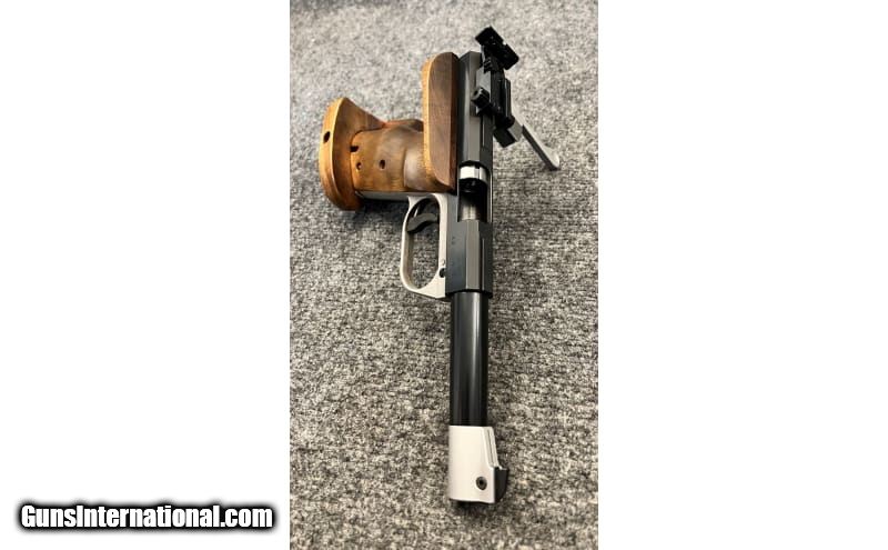 Description: Manufactured in Germany, just across the Swiss border, this unique bolt action single shot pistol features an alloy frame and cocking lever. Originally designed as an Olympic Free Pistol, this extremely accurate firearm has a patridge blade front and fully adjustable rear sights. The top of the receiver is factory dovetail grooved for an optical sight, making it also very suitable for hunting. It is fitted with contoured target style grips with an adjustable base, and includes an adjustable target trigger. .22 Long Rifle SOLD Chambers: .22 long rifle Metal Condition: Very good. Wood Condition: Very good. Bore Condition: Very good. Barrels: 5 3/4 inches Weight: 2 Lbs. 8 Oz. Sights: "Iron target sights, patridge front and adjustable rear. Item Location: Albuquerque, NM |