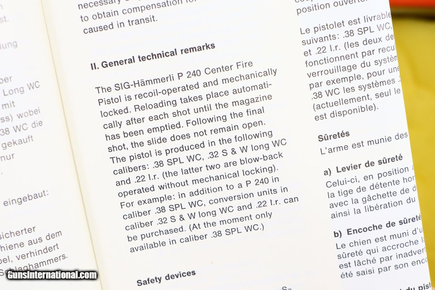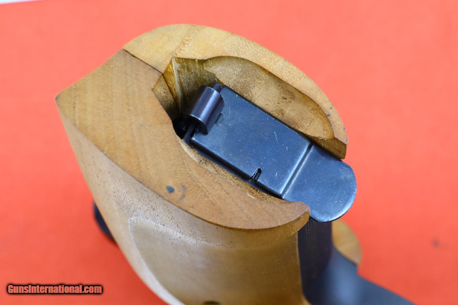 Description: Designed by SIG, this pistol was manufactured by their Hammerli subsidiary in Lenzburg. It is estimated that fewer than 3,000 pistols in .38 Special WC were manufactured in total, this example one of the earliest guns made in 1975. This is a standard configuration pistol, with fully adjustable target grade sights, manufacturer reference on the left side of the slide, SN and caliber repeated on the right side of the barrel and slide, the serial number on the frame. Fitted with smooth oversized ergonomic grips. Typical SIG designed magazines with a zippered spine. Takedown tool, Hammerli sticker, P240 instruction booklet, and hand numbered shipping box whose original gray foam has disintegrated, the bottom section newer foam rubber. Synopsis: A virtually new SIG Hammerli P240, .38 SPL W.C., a massive Swiss target pistol, reportedly 3000 completed in this caliber, with spare magazine, takedown tool, multi-lingual instruction booklet, and an original shipping box. Condition: 99+% original blue with comparable condition grips. Magazines with insertional wear on their spine. VG+ literature with expected folds and stains. Crisp shipping box with replaced foam. A massive, top condition and scarce target pistol that should appeal to every collector of Swiss/high precision firearms! ~~Insured shipping fee of $75; most packages shipped using FedEx 2nd Day.~~ SOLD Manufacturer: Hammerli Serial Number: P200690 Caliber Info: .38 Special WC |