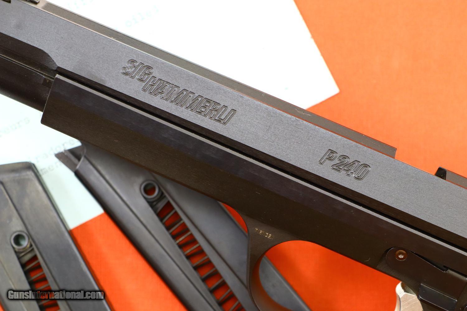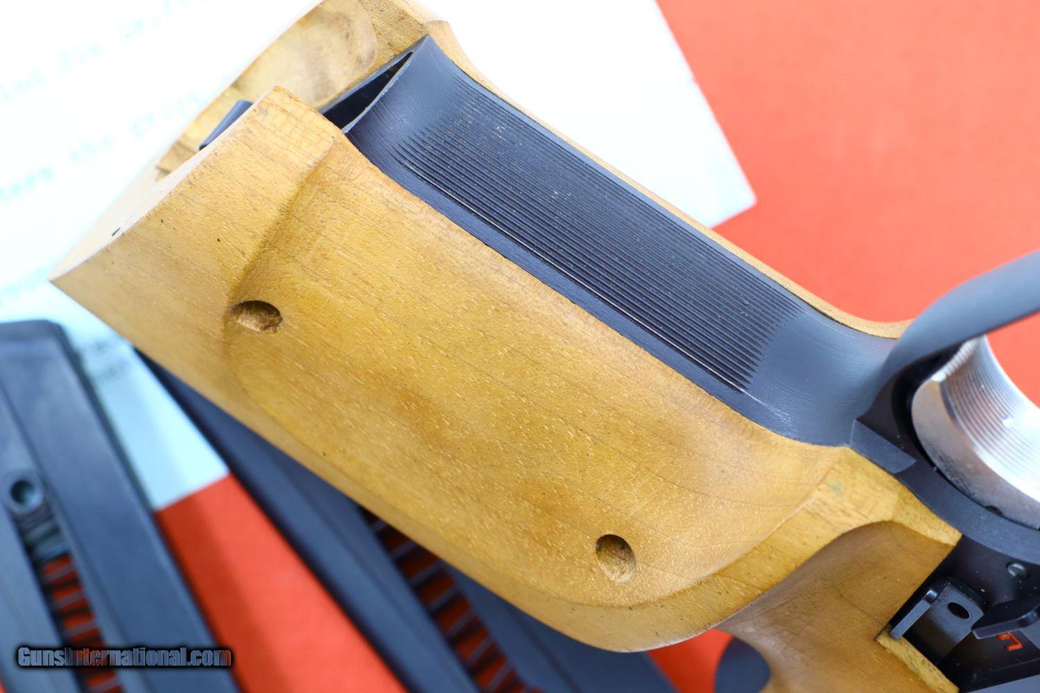 Description: Designed by SIG, this pistol was manufactured by their Hammerli subsidiary in Lenzburg. It is estimated that fewer than 3,000 pistols in .38 Special WC were manufactured in total, this example one of the earliest guns made in 1975. This is a standard configuration pistol, with fully adjustable target grade sights, manufacturer reference on the left side of the slide, SN and caliber repeated on the right side of the barrel and slide, the serial number on the frame. Fitted with smooth oversized ergonomic grips. Typical SIG designed magazines with a zippered spine. Takedown tool, Hammerli sticker, P240 instruction booklet, and hand numbered shipping box whose original gray foam has disintegrated, the bottom section newer foam rubber. Synopsis: A virtually new SIG Hammerli P240, .38 SPL W.C., a massive Swiss target pistol, reportedly 3000 completed in this caliber, with spare magazine, takedown tool, multi-lingual instruction booklet, and an original shipping box. Condition: 99+% original blue with comparable condition grips. Magazines with insertional wear on their spine. VG+ literature with expected folds and stains. Crisp shipping box with replaced foam. A massive, top condition and scarce target pistol that should appeal to every collector of Swiss/high precision firearms! ~~Insured shipping fee of $75; most packages shipped using FedEx 2nd Day.~~ SOLD Manufacturer: Hammerli Serial Number: P200690 Caliber Info: .38 Special WC |